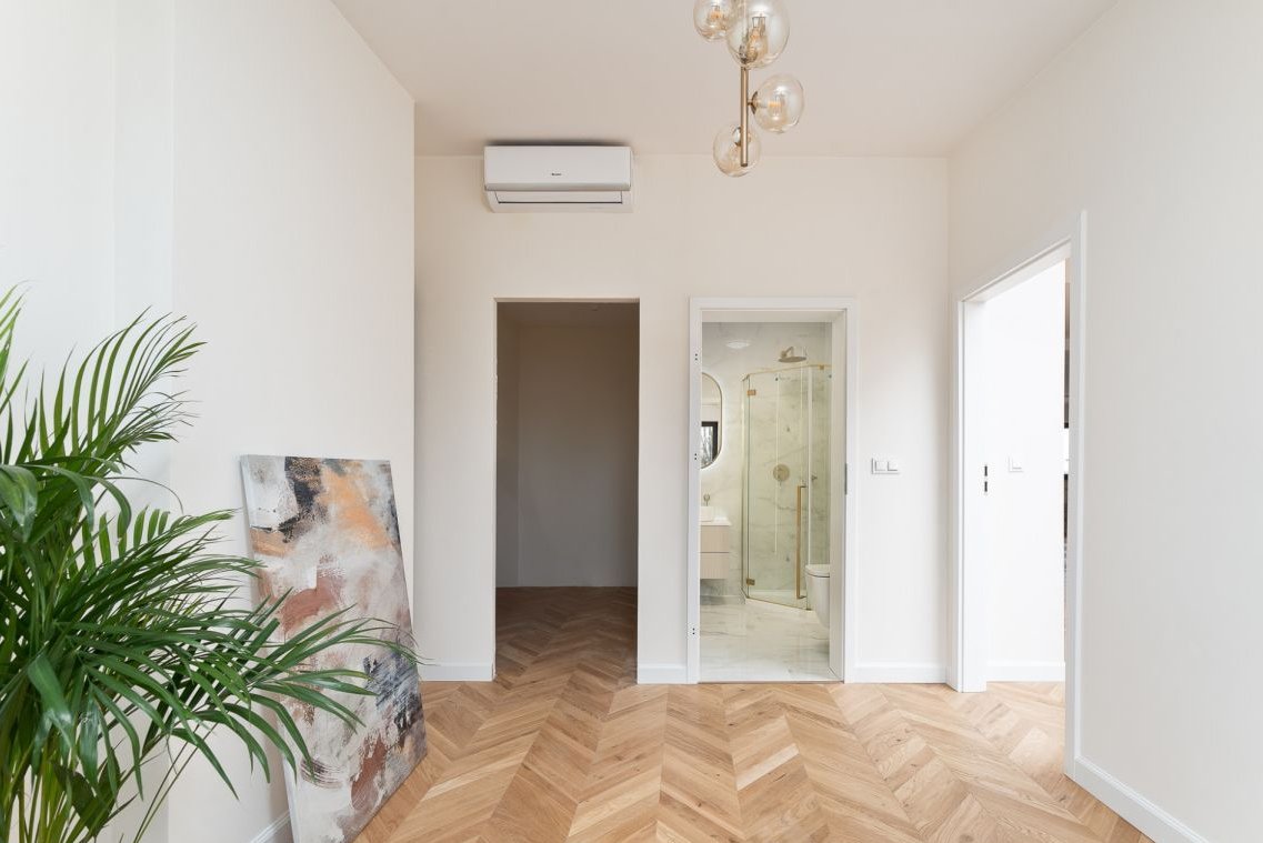 W całym apartamencie panuje niezwykła atmosfera. Ciepłe, jasne kolory przełamane ciemnymi akcentami dają poczucie spokoju i tworzą warunki do wypoczynku, relaksu. Projekt wykończenia wnętrza łączy ze sobą nowoczesne, najmodniejsze trendy designu z funkcjonalnością i domową atmosferą. Styl japandi stanowi fuzję stylu skandynawskiego z japońskim czerpiąc z nich to, co najlepsze. Widoczne jest w nim charakterystyczne dla estetyki scandi przywiązanie do komfortu, która idzie w parze z wyjątkową funkcjonalnością oraz przytulnością. Z drugiej strony można w nim zauważyć zamiłowanie do natury, które widoczne jest w japońskim nurcie aranżacyjnym. Ascetyzm form, geometryczne linie, minimalistyczne bryły.