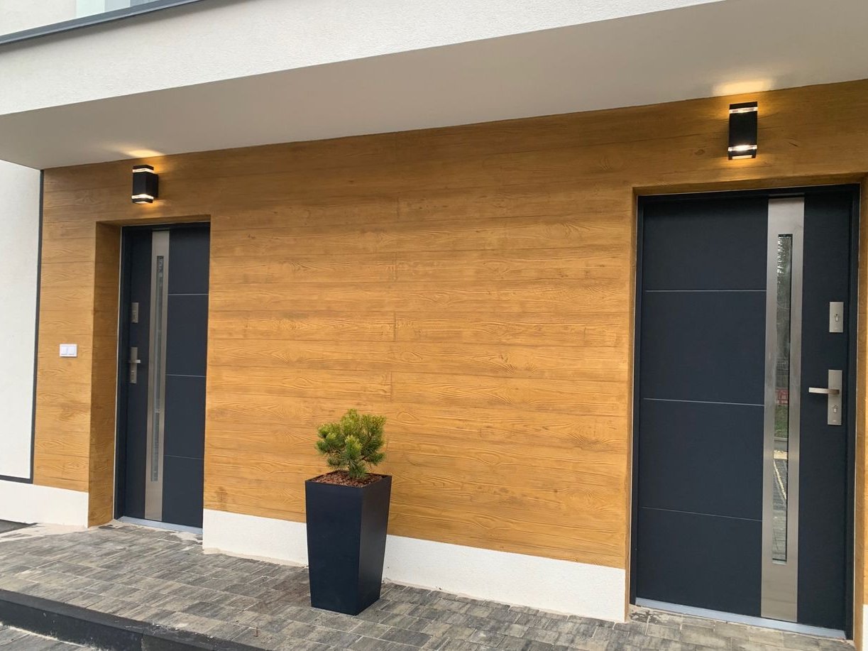 Wszystkie okna firmy Schuco, w tym duży przesuwny "HS", wideodomofon, tynki gipsowe, jastrychy cementowe,