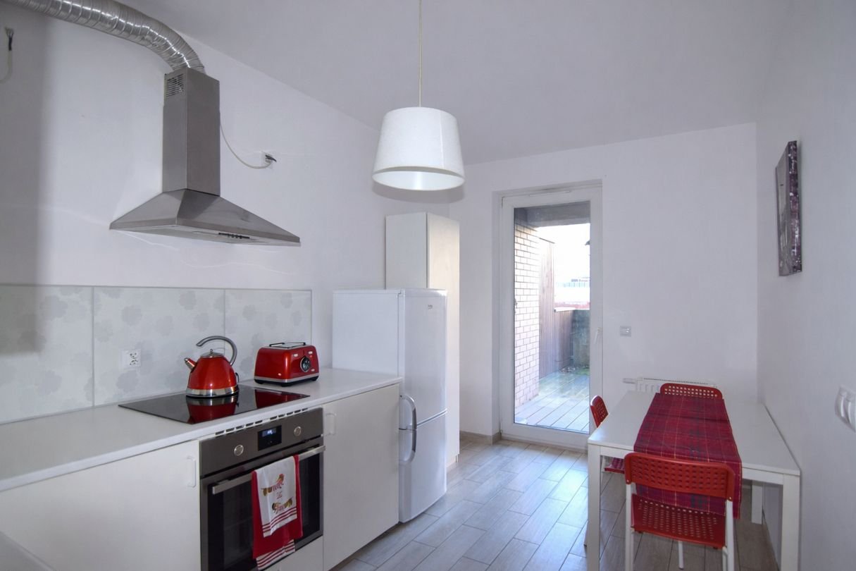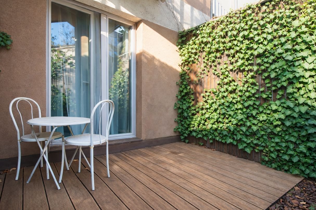 Z większego pokoju wyjście prowadzi na taras, natomiast z mniejszego pokoju oraz kuchni można wyjść na przestronny ogródek(25 m²) z widokiem na wewnętrzne patio – idealne miejsce do wypoczynku i relaksu, takze dla czworonoga.