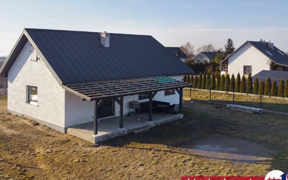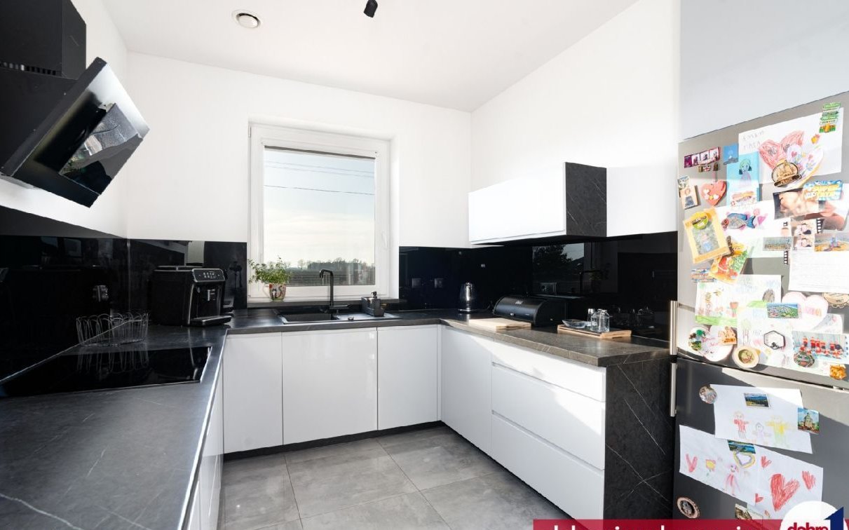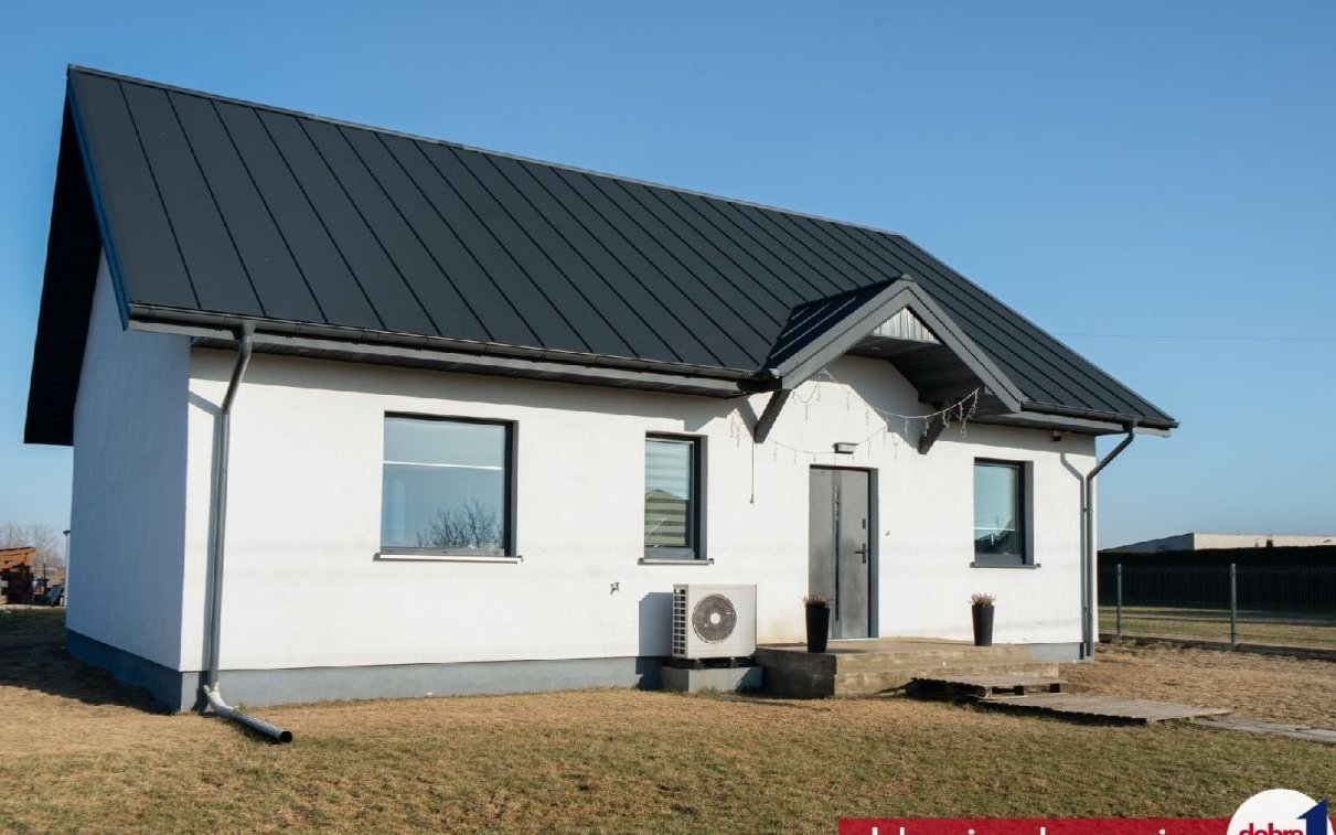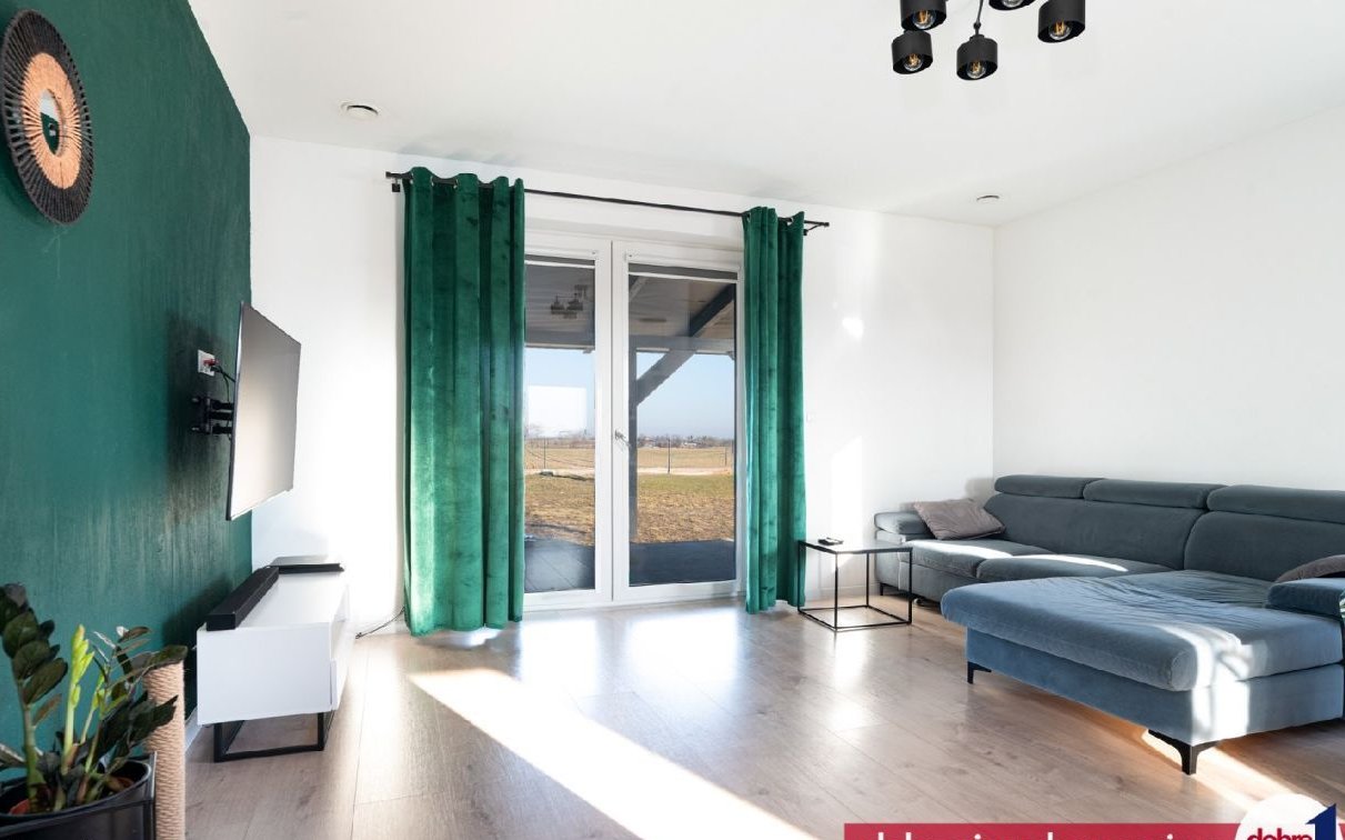 Dobre Nieruchomości oferują na sprzedaż wolnostojący, parterowy dom jednorodzinny o przemyślanym układzie, z zadaszonym tarasem i nowoczesną, prostą bryłą. Budynek jest zadbany i urządzony w spójnym, współczesnym stylu (jasne podłogi, białe zabudowy, czarne akcenty, dekoracyjne ściany), dzięki czemu nadaje się do zamieszkania bez dużych nakładów.