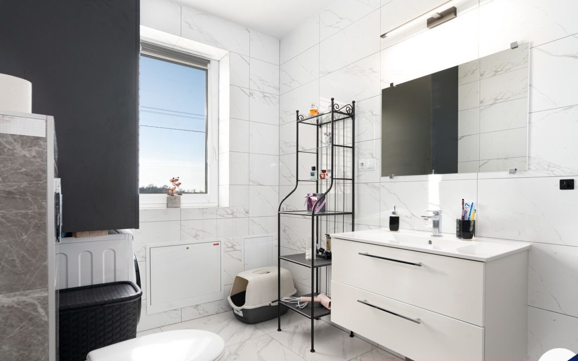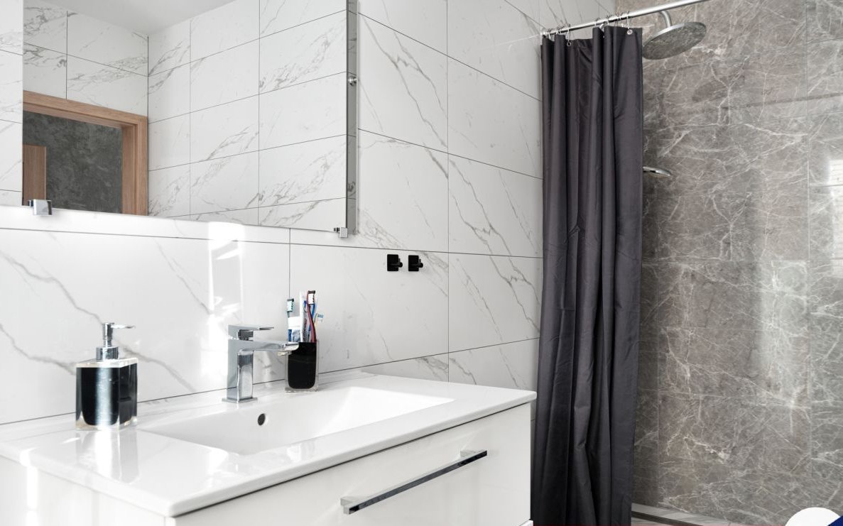 łazienka: jasne płytki typu marmur + strefa prysznica w grafitach