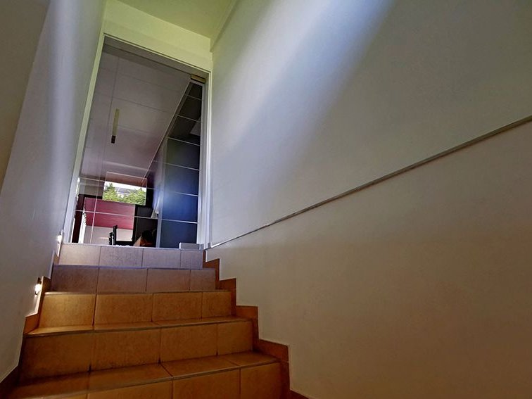 Pierwotnie projekt zakładał zrobienie garaży w bryle budynku. Obecnie miejsca parkingowe znajdują się pod wiatą, w której wydzielono również miejsce na drewutnię.