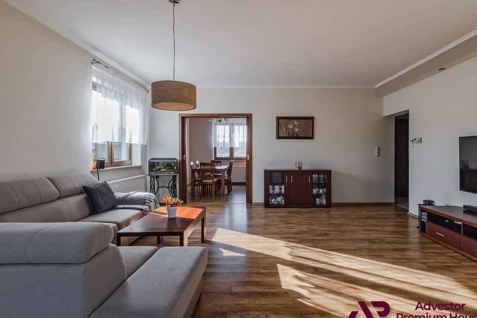 Sercem domu jest jasny salon (prawie 37 m²) z dużym przesuwnym oknem prowadzącym na taras i do ogrodu. To przestrzeń, w której toczy się codzienne życie: wspólne posiłki, spotkania, czas z rodziną. Jest kominek oraz klimatyzacja.