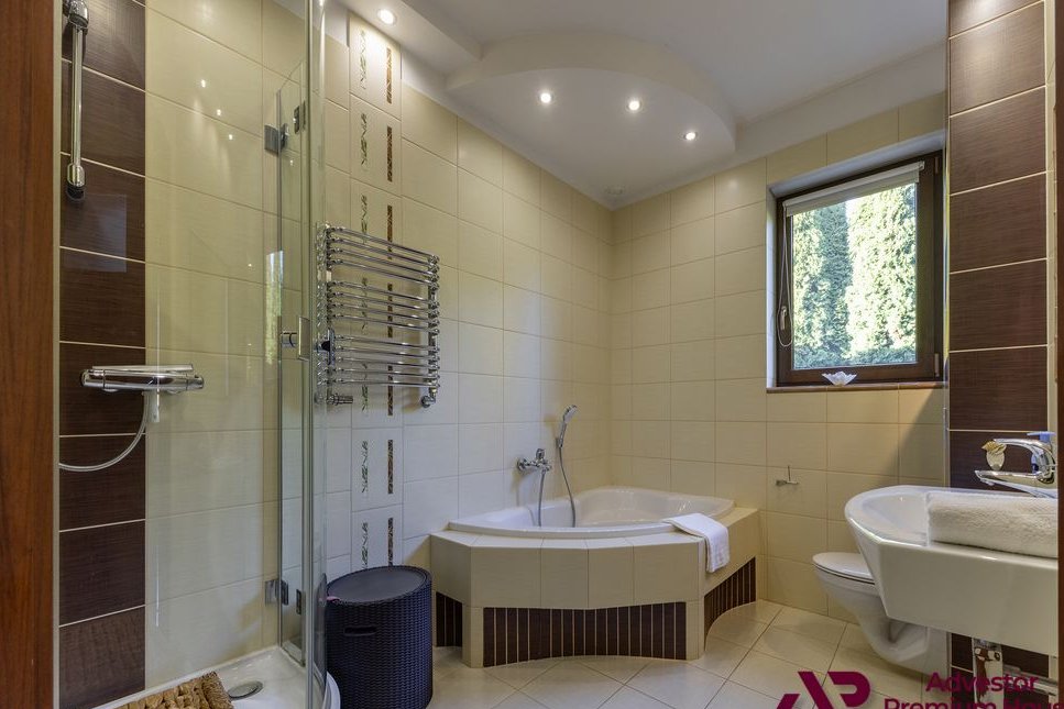 Wszystkie okna wyposażone są w automatyczne rolety, a bezpieczeństwo mieszkańców podnosi system alarmowy oraz monitoring. Brama wjazdowa i garażowa są automatyczne, co dodaje codziennej wygody.