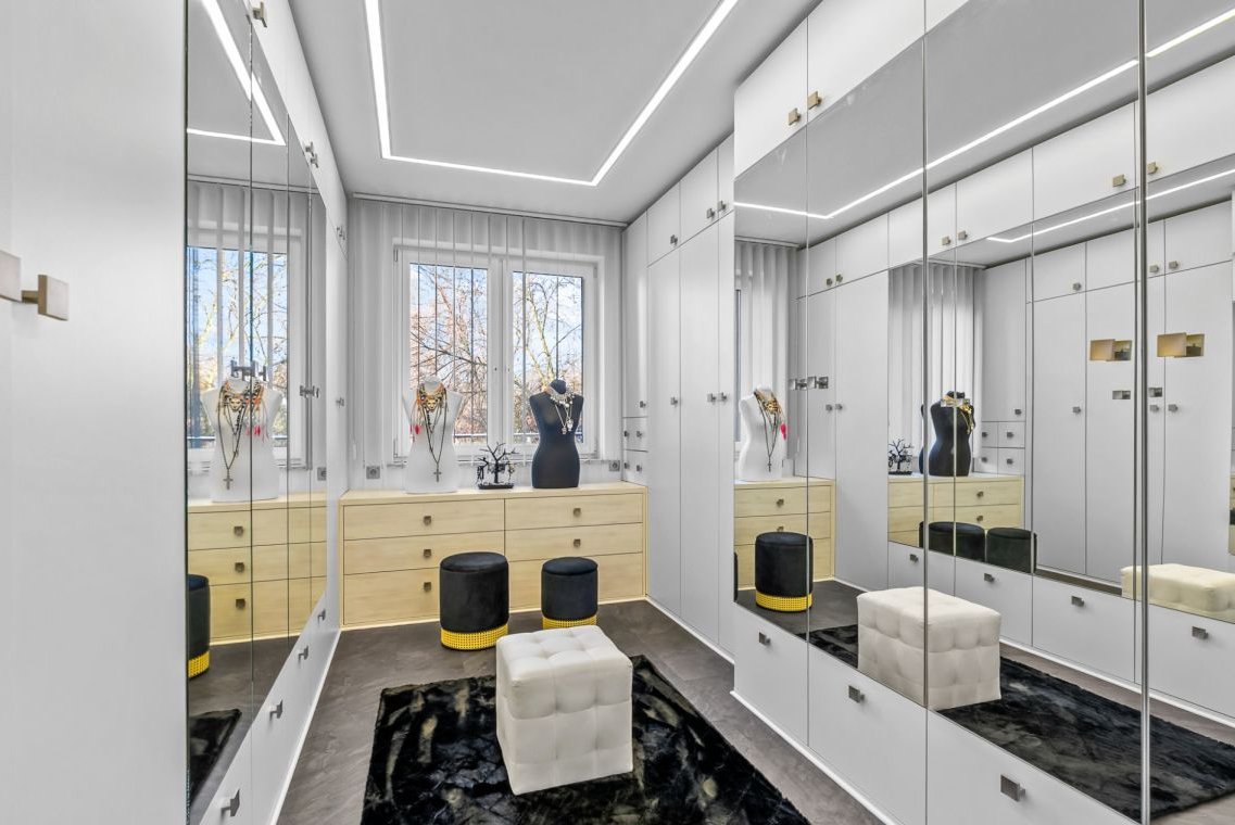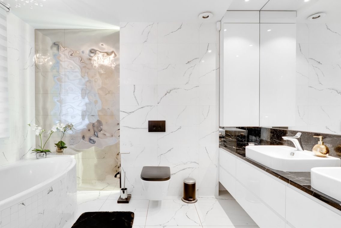 Wysokiej jakości materiały wykończeniowe naturalne drewno, gresy premium, designerskie oświetlenie.