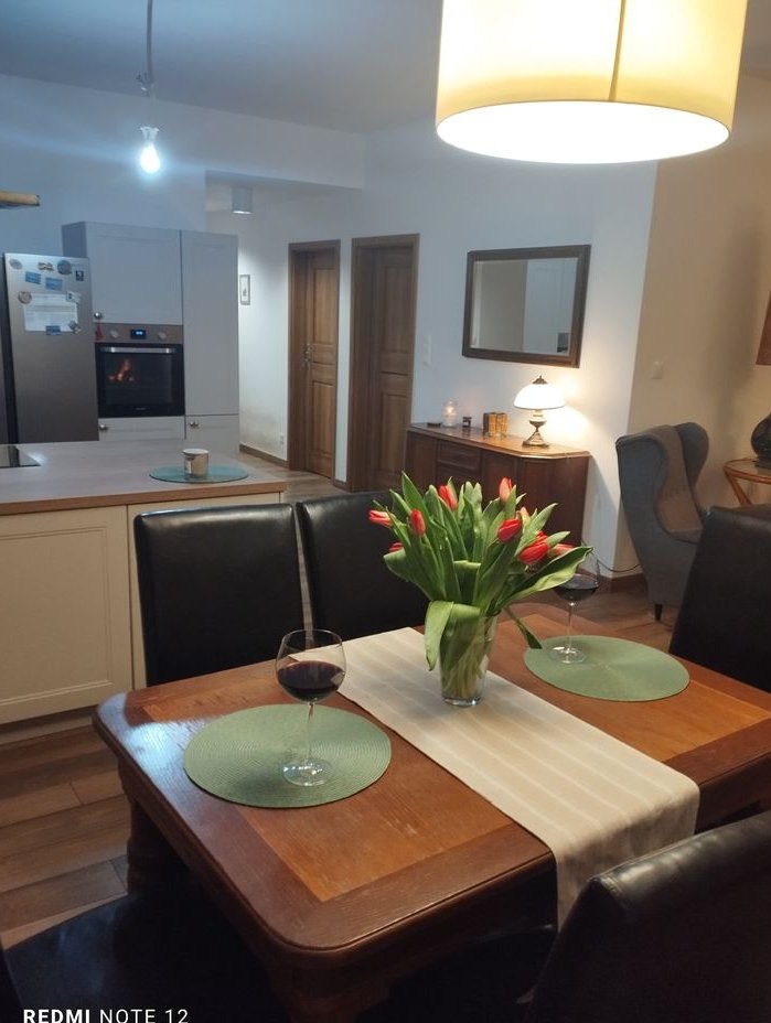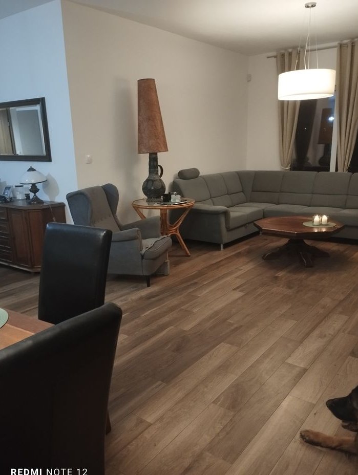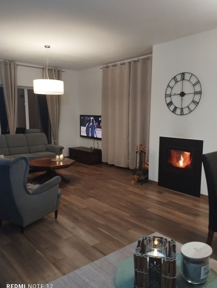 Wysoki standard wykończenia: meble kuchenne oraz blat produkowane na zamówienie w Niemczech sprzęt AGD marki Samsung ogrzewanie podłogowe w całym domu kominkowe rozprowadzenie ciepła do sypialni rolety antywłamaniowe drzwi antywłamaniowe Solidna konstrukcja i energooszczędność: konstrukcja dachu wiązarowa dach kryty blachodachówką strop wykończony płytą gipsową, ocieplony wełną (ok. 20 cm) elewacja ocieplona styropianem grafitowym 15 cm drewniane obicie zewnętrzne (sosna) wokół domu