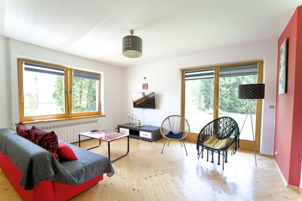 Dodatkowa przestrzeń na parterze daje możliwość stworzenia kolejnego apartamentu lub urządzenia wspólnej jadalni dla gości. Na pierwszym i drugim piętrze dostępne są także wspólne strefy wypoczynkowe. Pensjonat może pomieścić od 24 do 30 osób – gotowy biznes, który nie wymaga dodatkowych inwestycji!