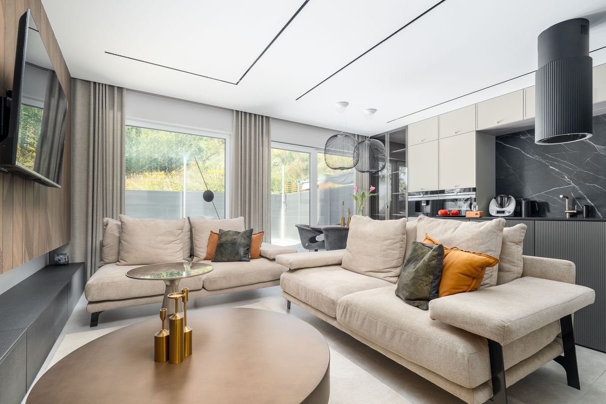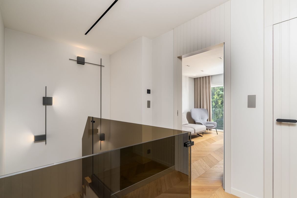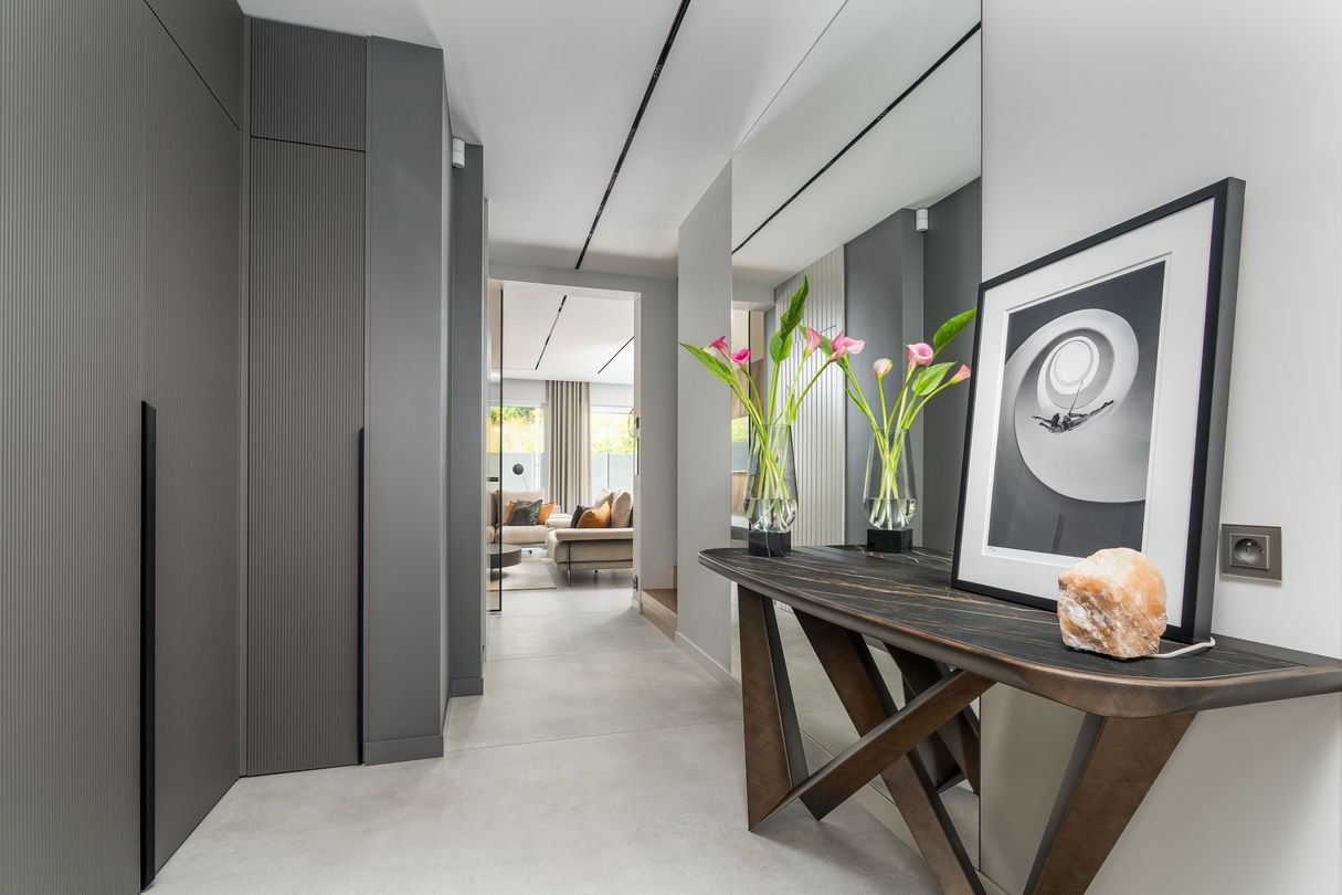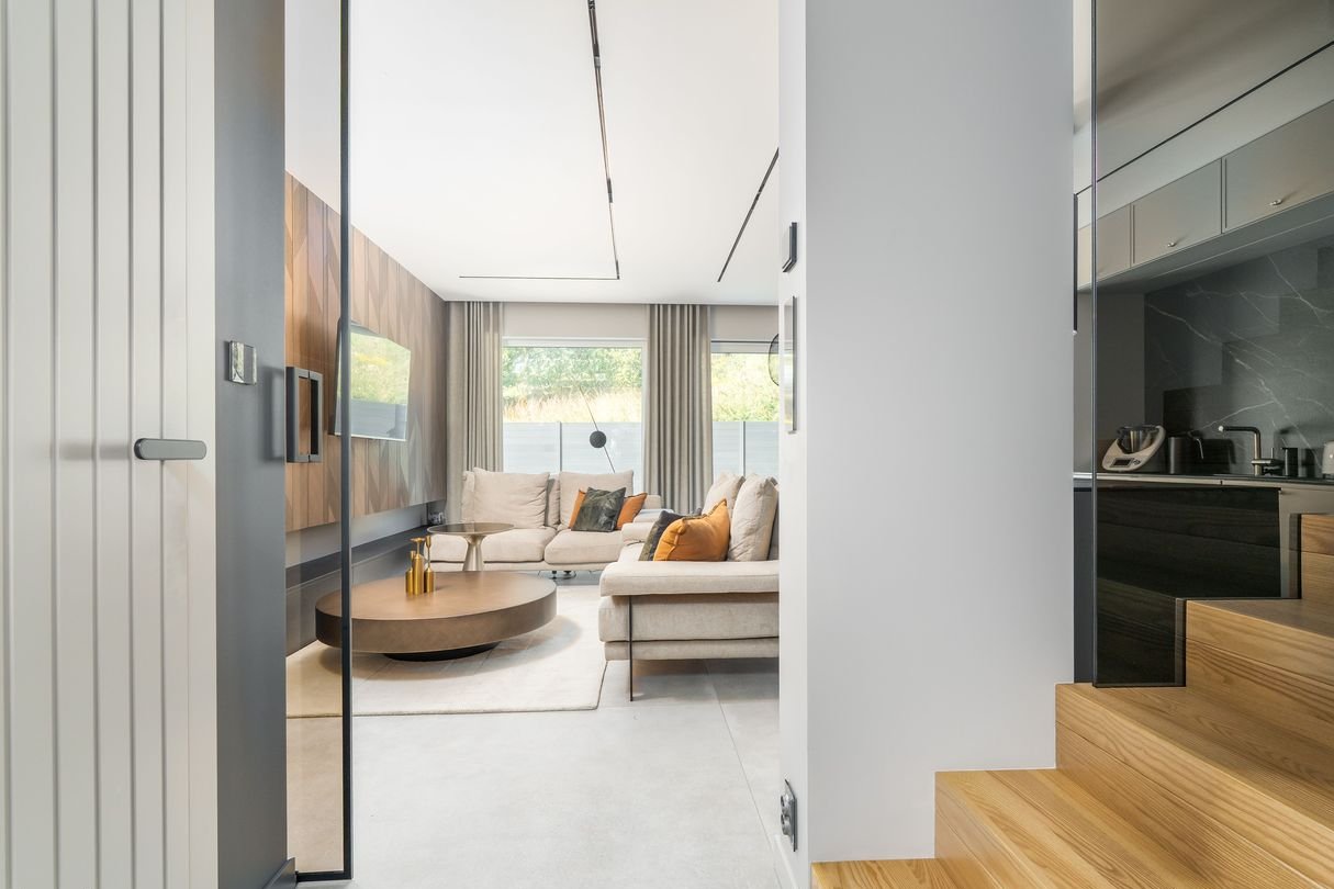 Wnętrza wykończono materiałami klasy Premium pochodzenia włoskiego i hiszpańskiego bez kompromisów. Widać tu dbałość o detal: spójne okładziny, precyzyjne fugowanie, dopasowane listwy i wysokiej jakości zabudowy wykonane na wymiar z materiałów o podwyższonej trwałości.