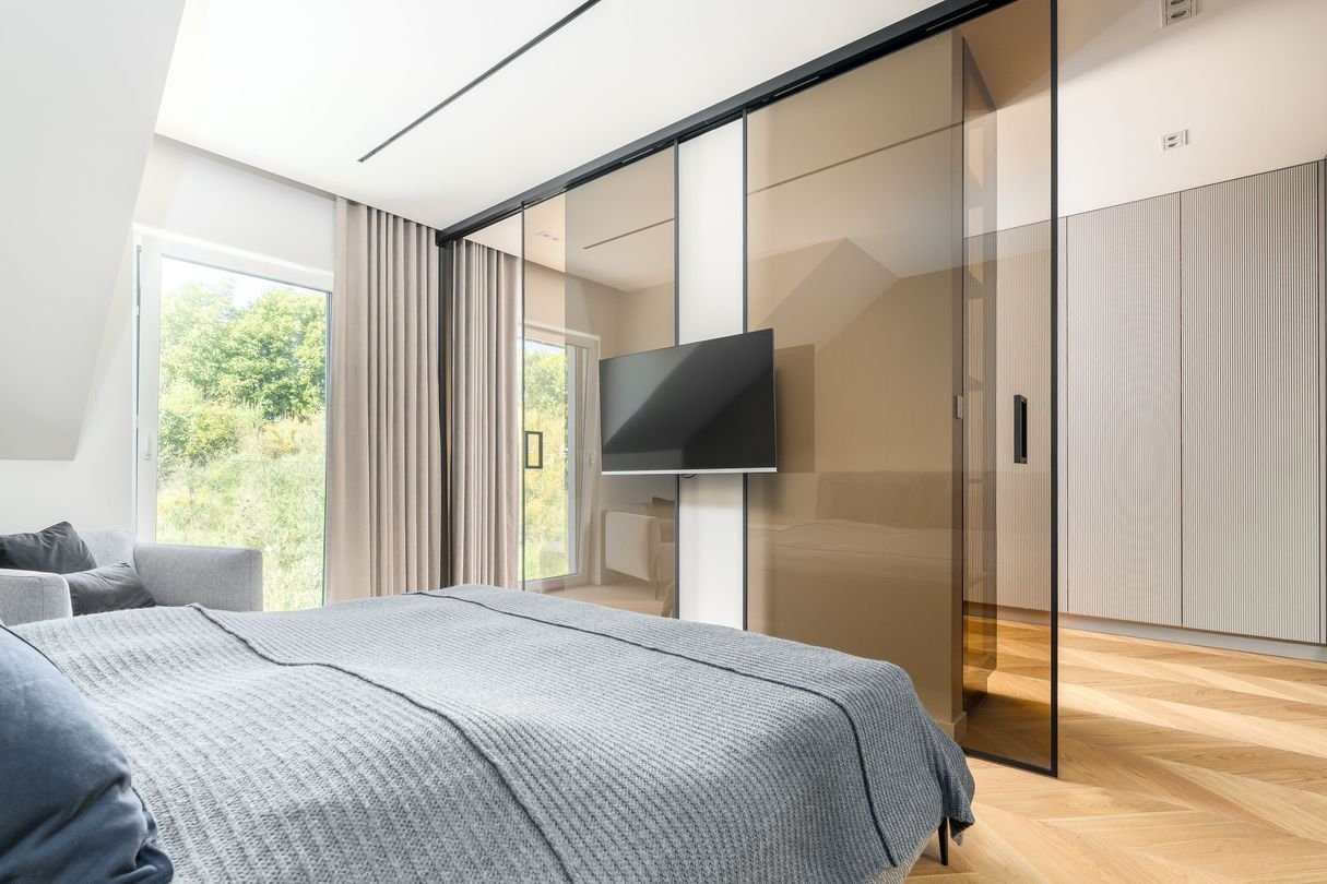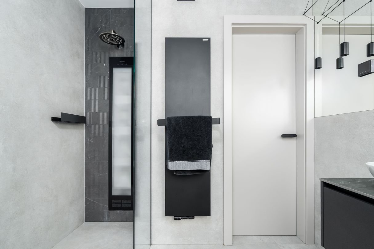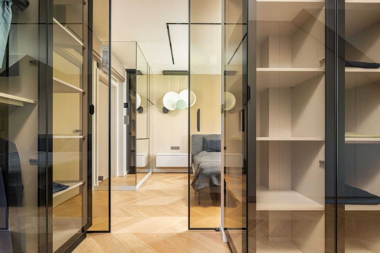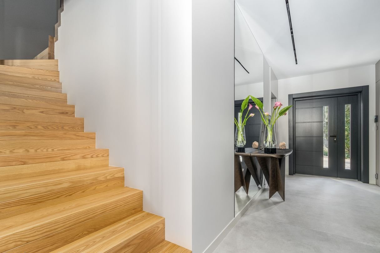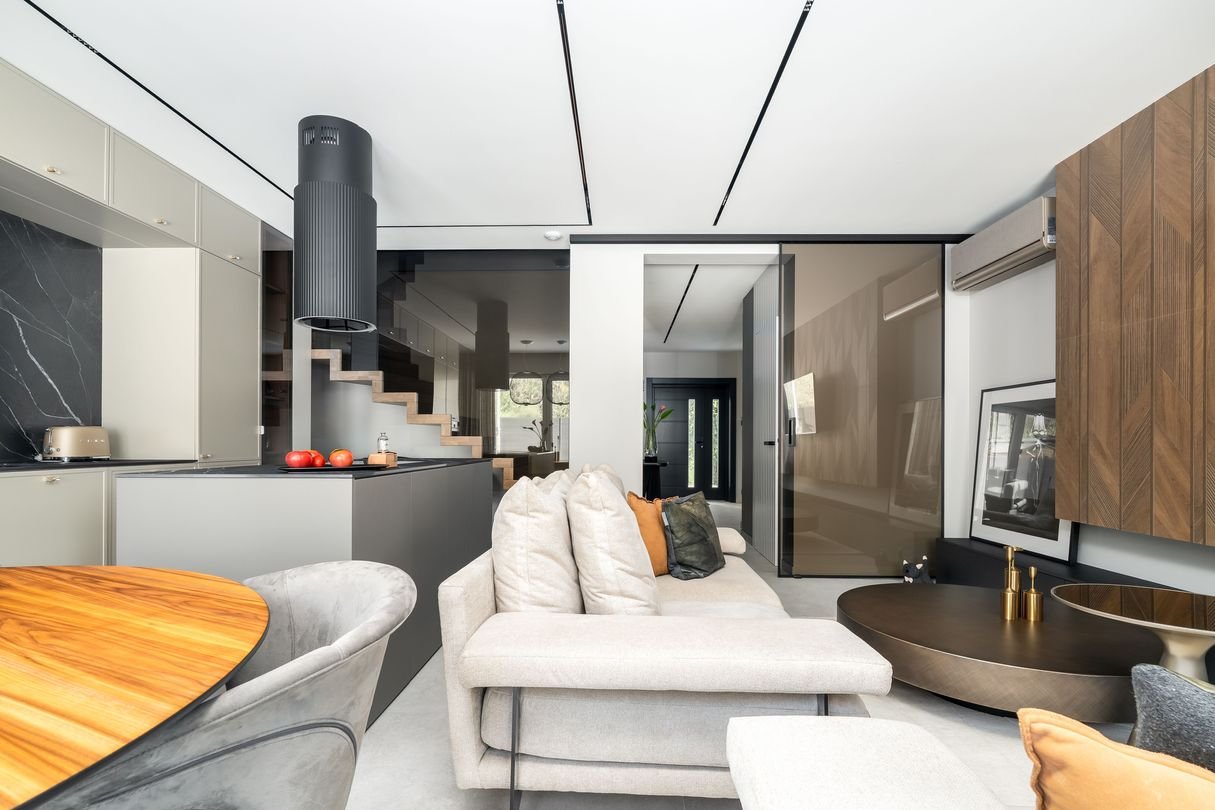 Wnętrza wykończono materiałami klasy Premium pochodzenia włoskiego i hiszpańskiego bez kompromisów. Widać tu dbałość o detal: spójne okładziny, precyzyjne fugowanie, dopasowane listwy i wysokiej jakości zabudowy wykonane na wymiar z materiałów o podwyższonej trwałości.