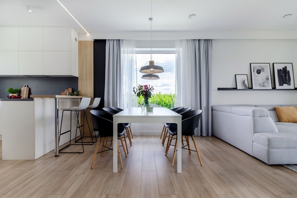 Strefa dzienna to jasny, przestronny salon połączony z kuchnią i jadalnią – miejsce wspólnych posiłków, spotkań z bliskimi i codziennego odpoczynku.