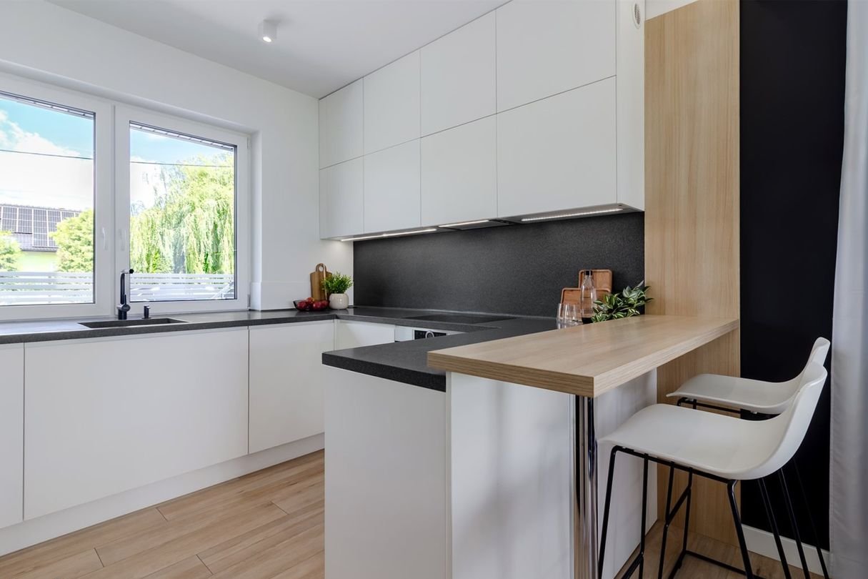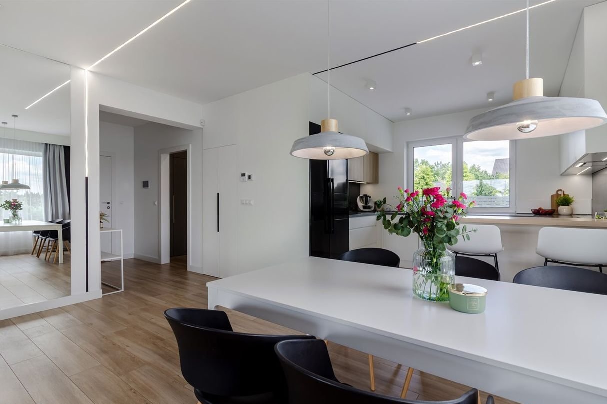 Wybudowany w 2020 roku, został wykończony pod okiem architekta w stylu minimalistycznym – prostym, spójnym i bardzo funkcjonalnym. Przestrzeń została zaprojektowana tak, aby codzienne życie było wygodne i intuicyjne.
