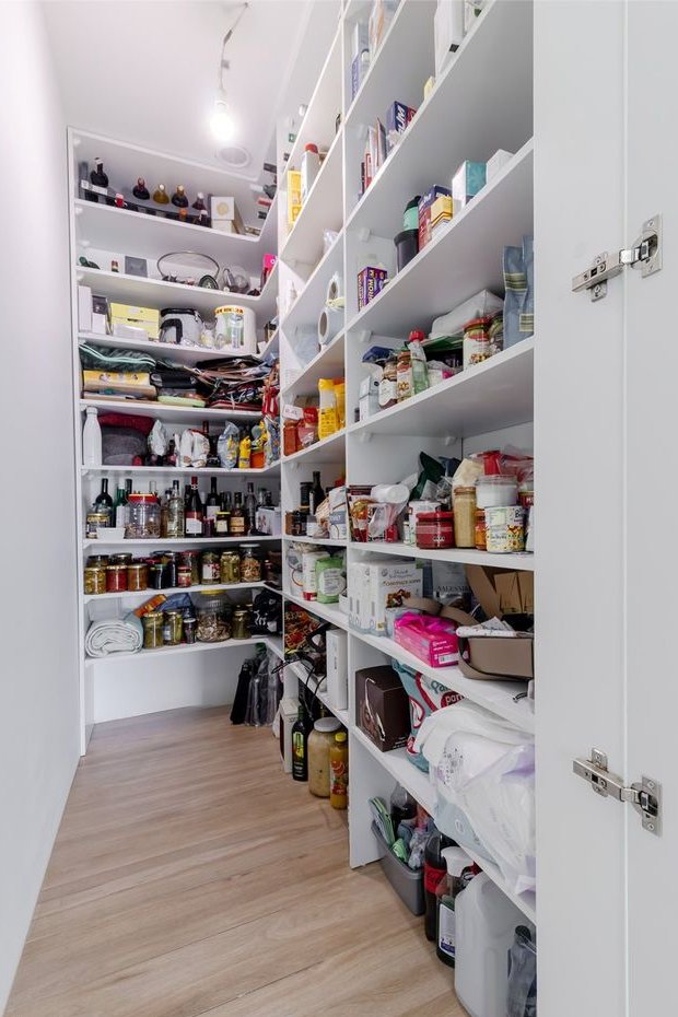Kuchnia posiada nowoczesną zabudowę, półwysep z dostawką oraz dużą, osobną spiżarnię, która znacząco podnosi komfort użytkowania.