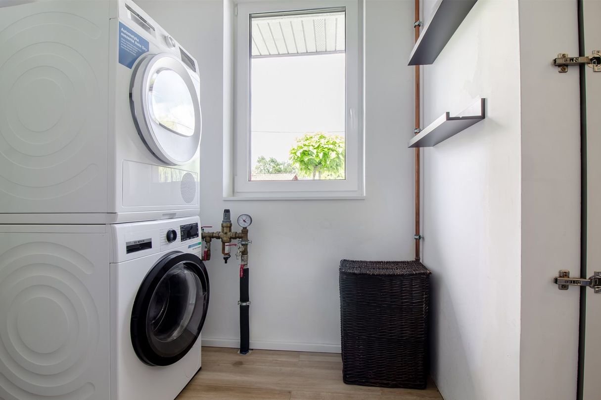 Część prywatna domu obejmuje trzy sypialnie, zapewniające spokój i intymność. Łazienka została wyposażona w przestronny prysznic typu walk-in, a dodatkowa toaleta oraz pralnia z kotłownią uzupełniają funkcjonalny układ wnętrza.
