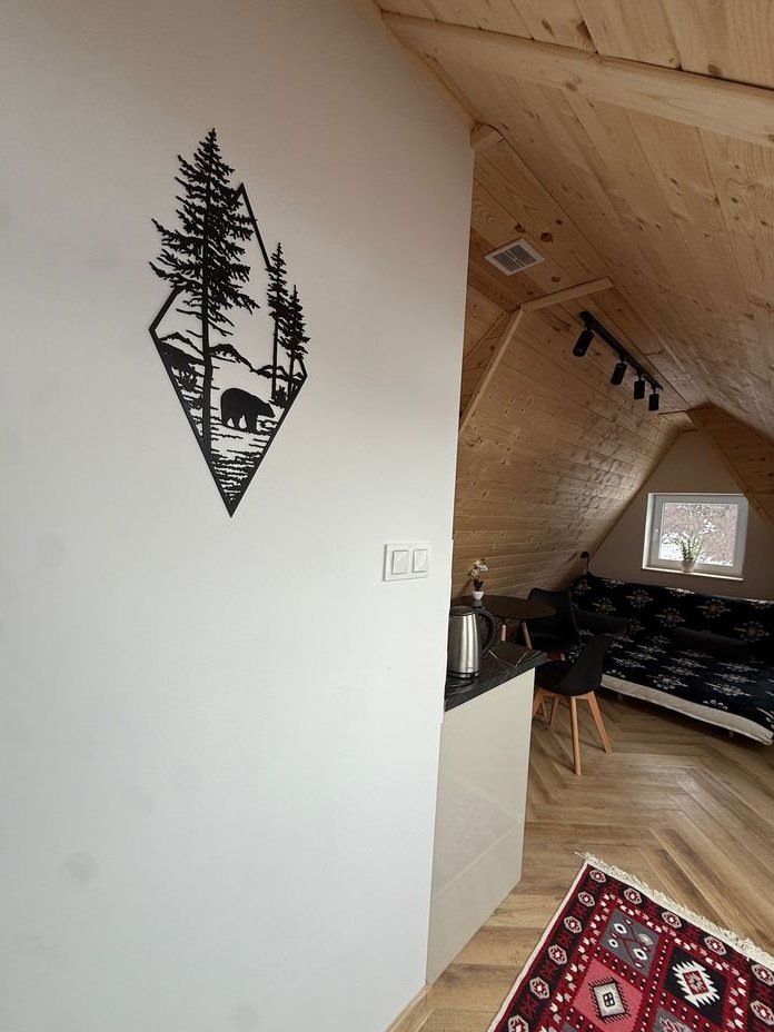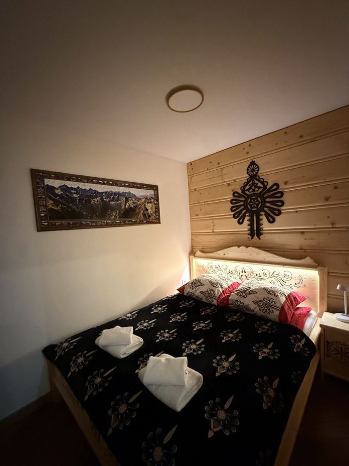 Apartament nr. 4 z widokiem na Tatry(2 piętro) : 45m2 + balkon , salon łączony z kuchnią + osobno łazienka z wanną, prysznicem i pralką + osobno sypialnia z dużym łóżkiem. Piękny widok na Tatry z salonu jak i z sypialni.Wykończony drewnem w stylu góralskim. Cena 620tys. zł. Naziemne miejsce parkingowe + 25.000zł. DOSTĘPNY