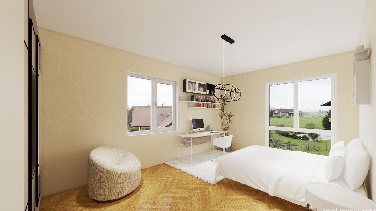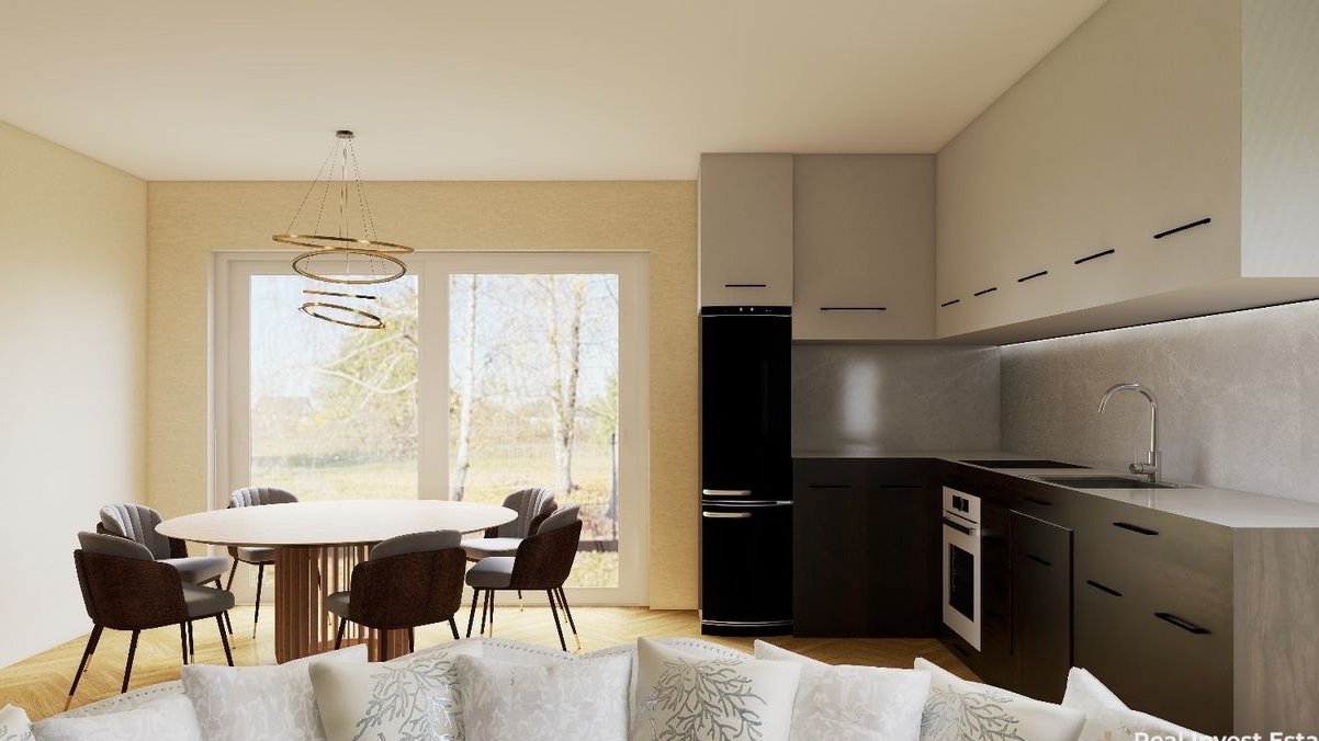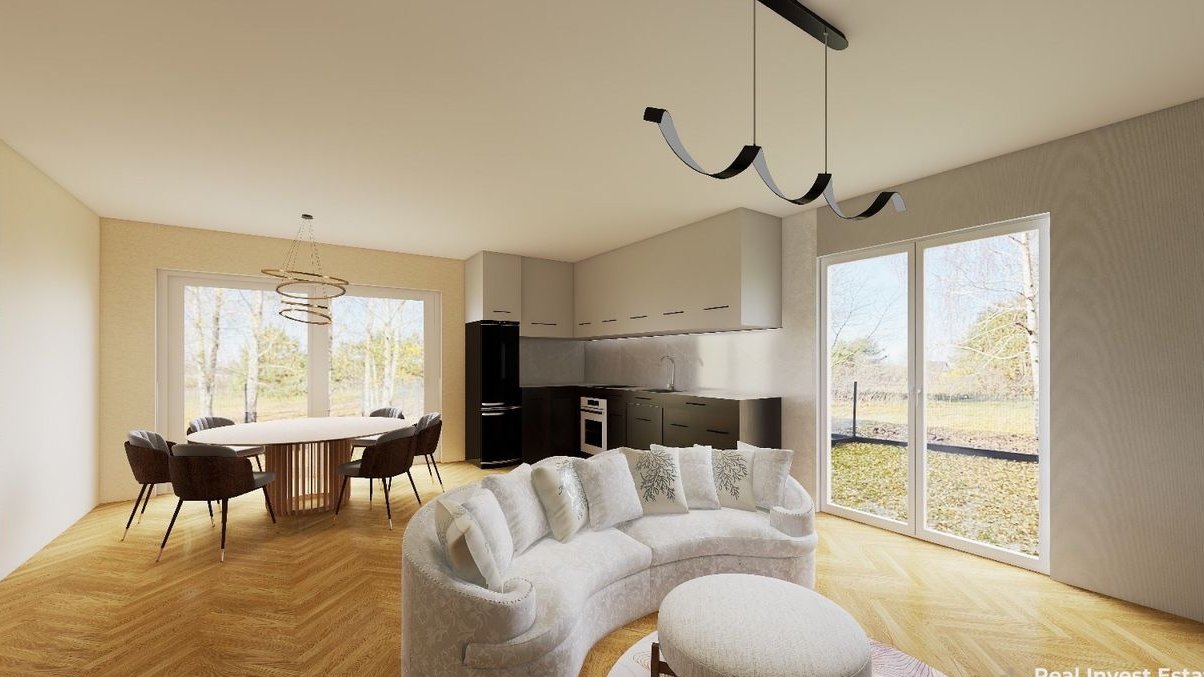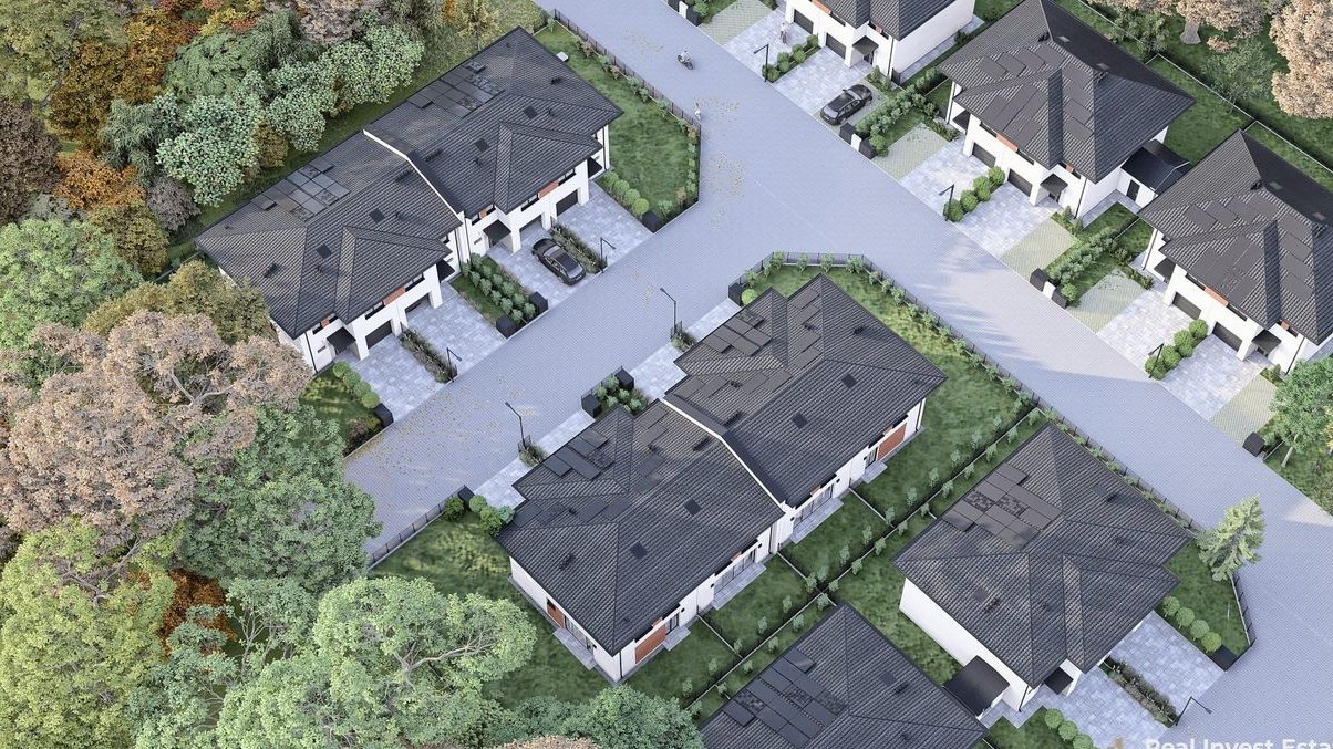 Zdjęcia i wizualizacje przedstawiają przykładową realizację.Materiał wideo prezentuje domy zrealizowane w I etapie inwestycji, położonym bezpośrednio w sąsiedztwie aktualnie realizowanego II etapu.