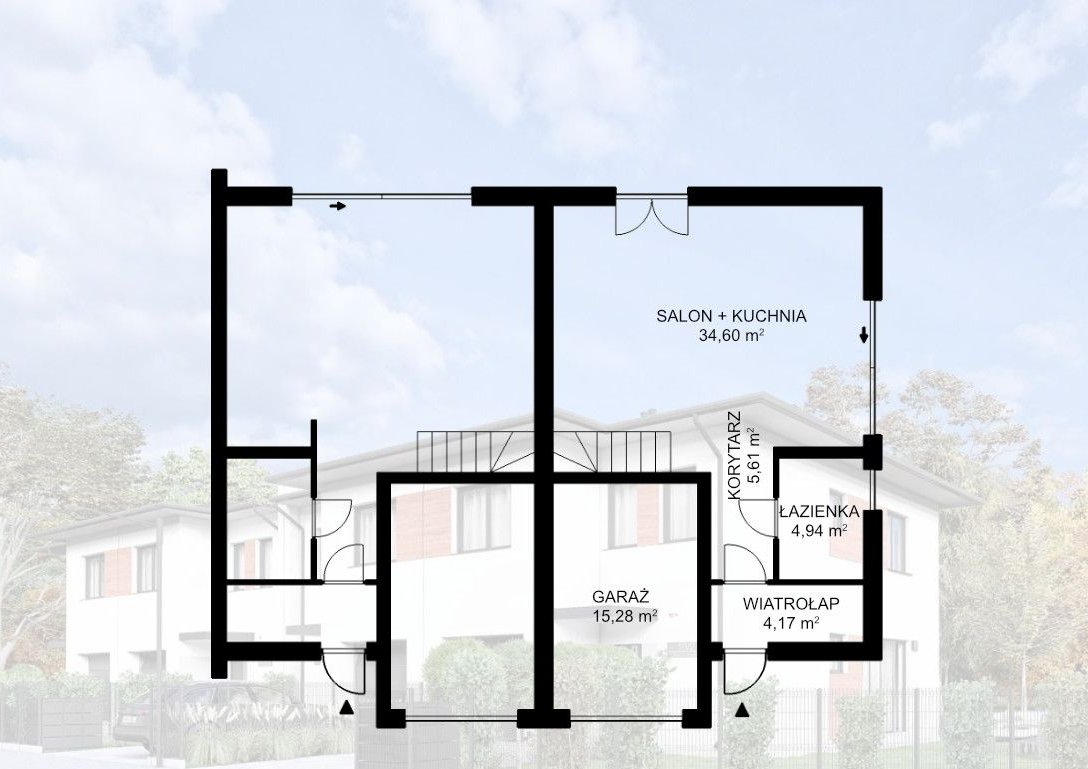 Parter stanowi komfortową strefę dzienną obejmującą przestronny salon z dużym, 4-metrowym oknem przesuwnym typu HST z wyjściem na ogród, funkcjonalną kuchnię, łazienkę, wiatrołap oraz garaż w bryle budynku.