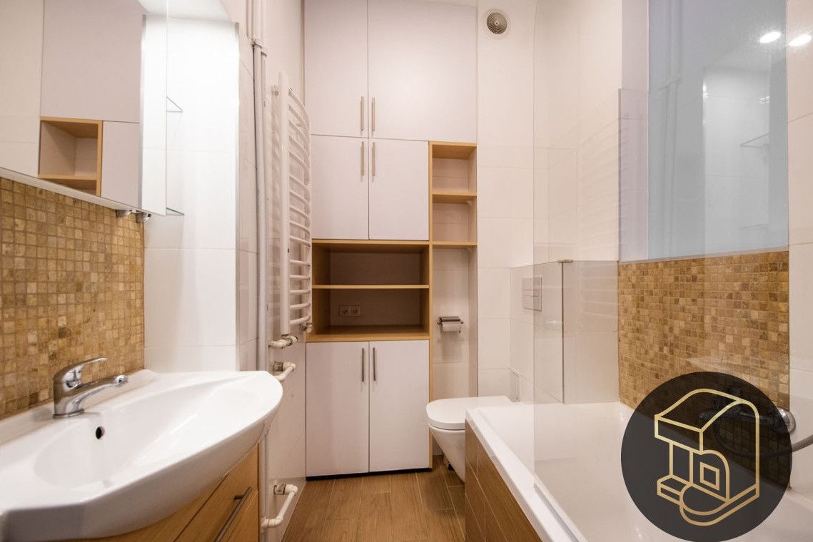 Łazienka została wyposażona w mleczne okno fix, które daje dodatkowe światło dzienne. Wyposażona w wannę z funkcją prysznica, umywalkę oraz przestrzeń do przechowywania jest idealnie zaprojektowana z optymalnym wykorzystaniem przestrzeni