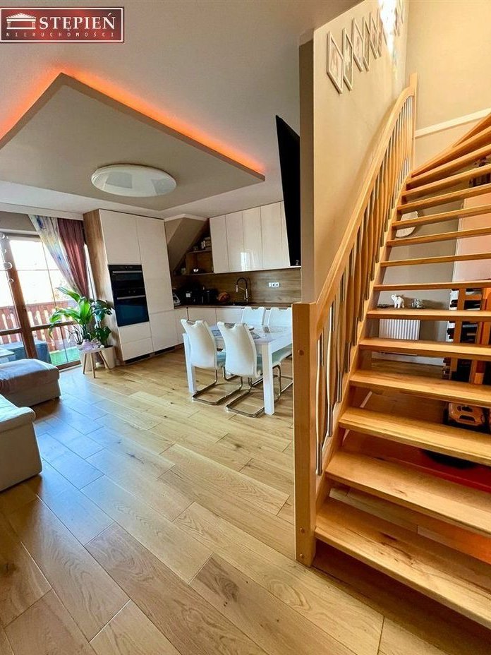 Dwupoziomowy apartament, w którym Twoja rodzina naprawdę poczuje się jak w domuWyobraź sobie poranek. Dzieci szykują się do szkoły, w salonie pachnie kawa, a przez balkonowe drzwi wpada świeże, górskie powietrze. Tu życie płynie spokojniej – bez miejskiego hałasu, ale z pełnym komfortem.Na sprzedaż wyjątkowy, dwupoziomowy apartament o powierzchni około 75 m², położony na pierwszym piętrze kameralnego budynku, na ogrodzonym terenie z bramą wjazdową na pilota. Bezpieczeństwo, prywatność i wygoda – dokładnie to, czego szuka rodzina z dziećmi.Do mieszkania przynależą dwa miejsca parkingowe na wyłączność – zawsze wracasz i parkujesz bez stresu.Przemyślana przestrzeń dla rodzinyPoziom I – serce domu