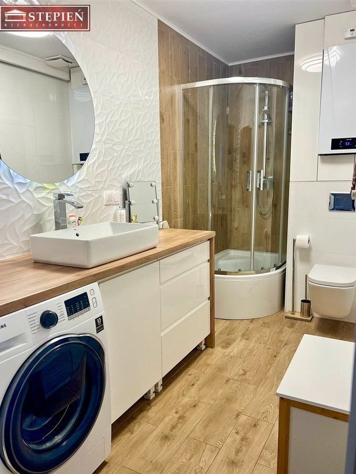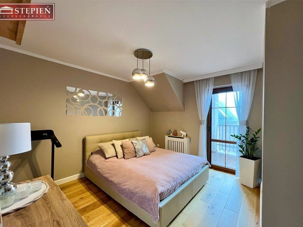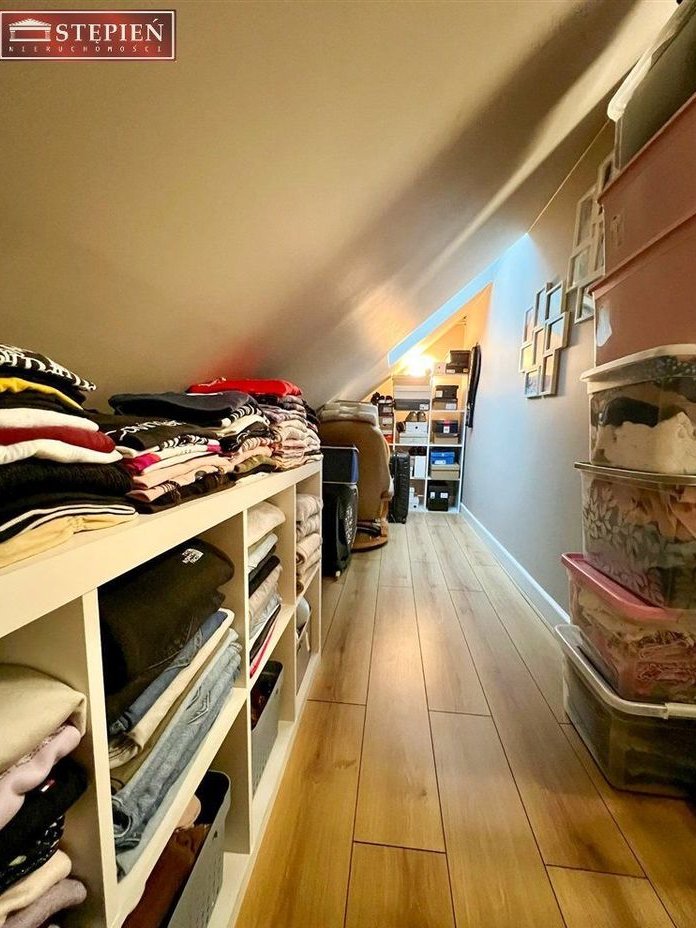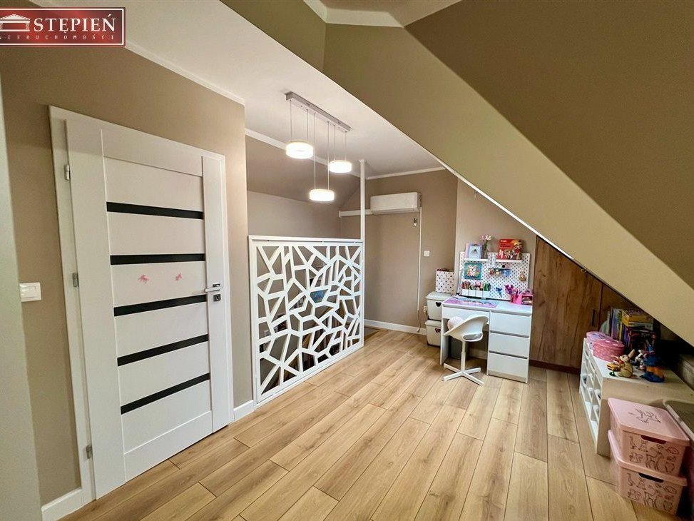 Dodatkowo wydzielona garderoba pomaga utrzymać porządek i doskonale organizuje codzienność.Dwupoziomowy układ naturalnie oddziela strefę dzienną od prywatnej – każdy domownik ma tu swoją przestrzeń.Komfort, który czuć każdego dnia:elegancka deska barlinecka na podłogach,