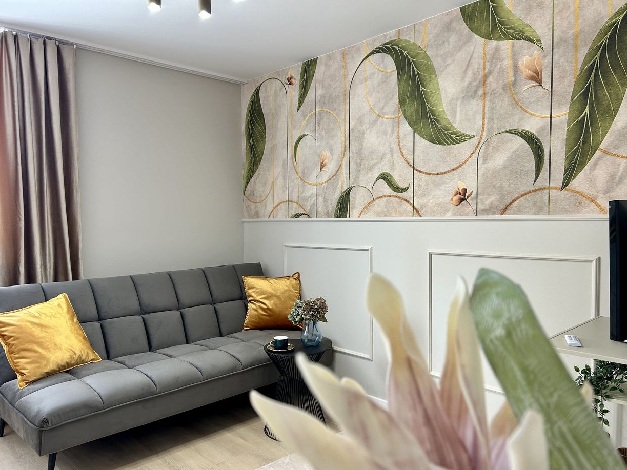 Na ścianach są dekoracyjne sztukaterie, klimatyczne tapety, a łazienka została wykończona w kaflach imitujących kamień i drewno. Na podłogach panele winylowe.