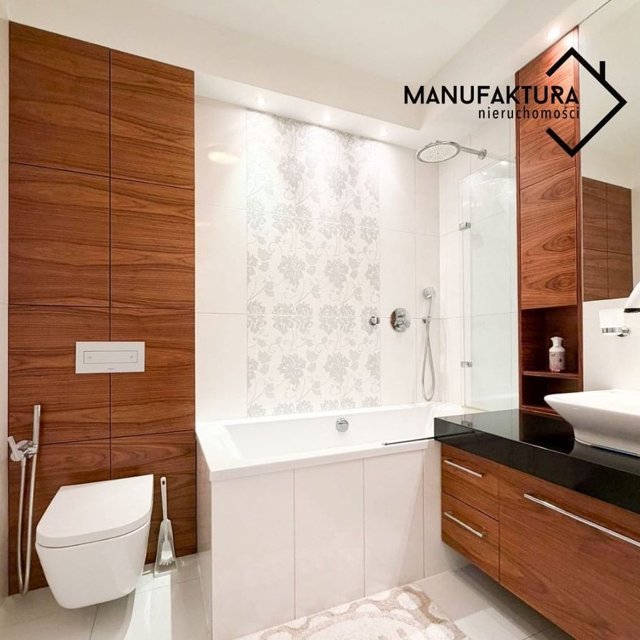 Elegancka łazienka została wyposażona w wannę, prysznic oraz bidetkę i wykończona materiałami klasy premium.