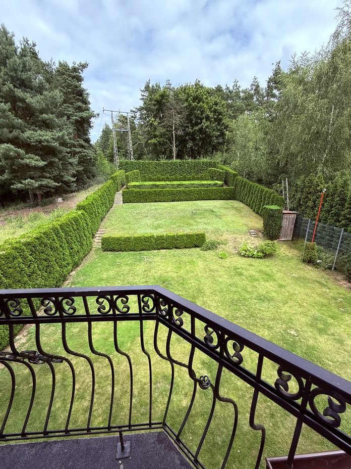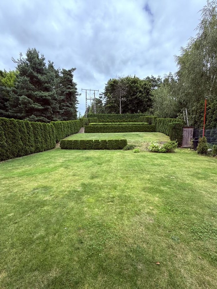 Na działce posadzone są liczne krzewy ozdobne, starannie przycinane.