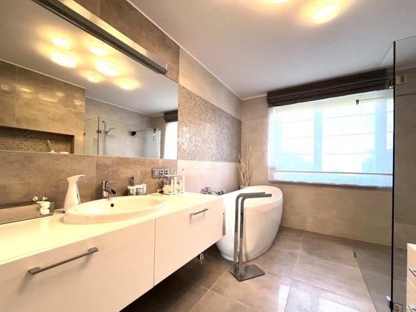 Ogrzewanie i c.w. w całości z pieca gazowego. Dodatkowo kominek oraz stacja uzdatniania wody (własna studnia). Dom wyróżnia się nie tylko swoim eleganckim wyglądem, ale także solidnością i jakością wykonania.