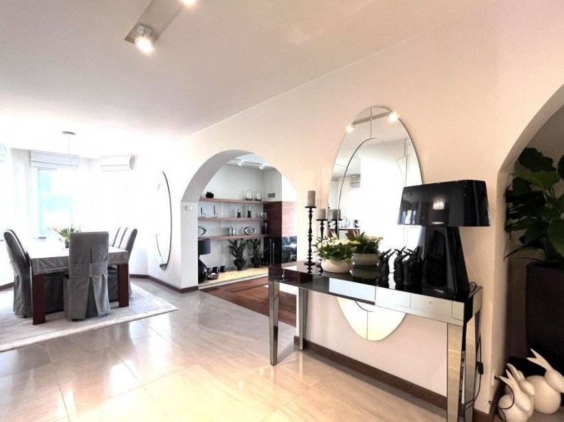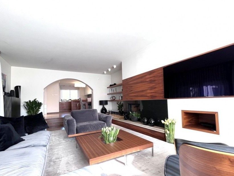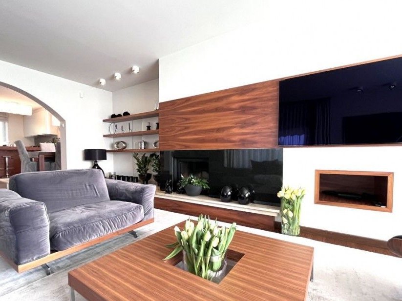 Salon wyróżnia się swoją elegancją i funkcjonalnością. Otwarta przestrzeń o powierzchni 40 metrów kwadratowych rozpływa się w naturalnym świetle, które wpada przez duże okna, otwierając się na malowniczy ogród. W salonie stoi imponujący kominek z marmuru, dodając nie tylko ciepła, ale także wyrafinowanego uroku.