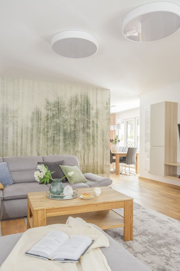 4. Duży salon z kuchnią częściowo oddzielony ścianą - otwarte przejście do kuchni jest z dwóch stron. Kuchnia jest bardzo przestronna i ma mnóstwo blatów. Jadalnia jest połączona kuchnią częściowo oddzielona kwietnikiem. W jadalni mieści się duży drewniany stół na 8 osób. W przypadku większej ilości gości stół można rozłożyć w salonie. Po rozłożeniu stół ma 5m długości (salon + kuchnia 89m2)