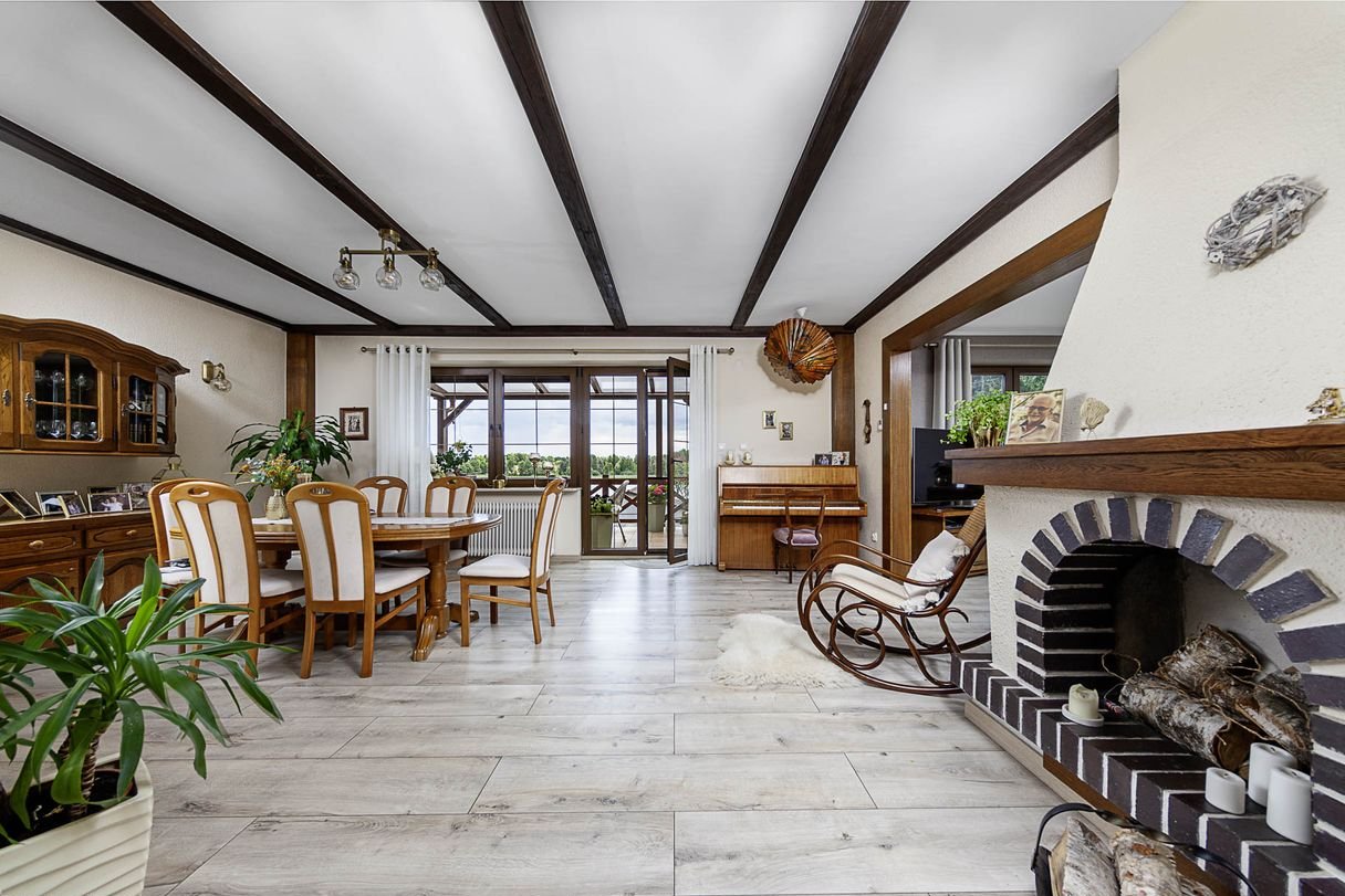 przestronny salon z kominkiem