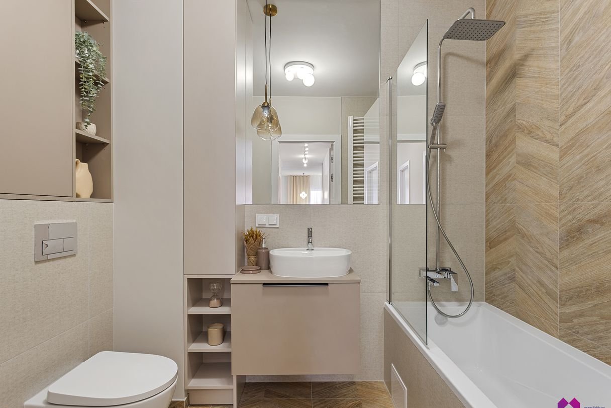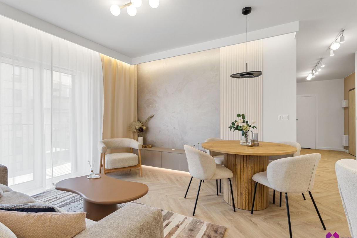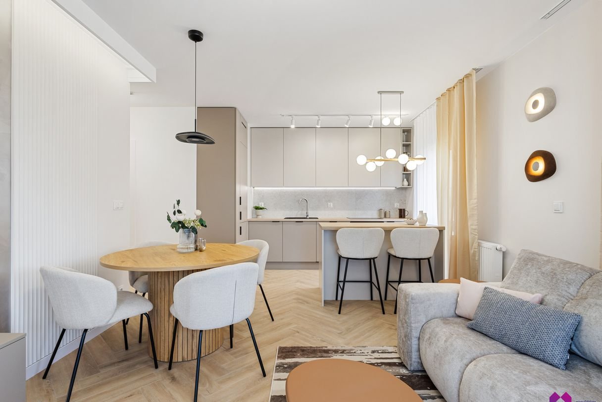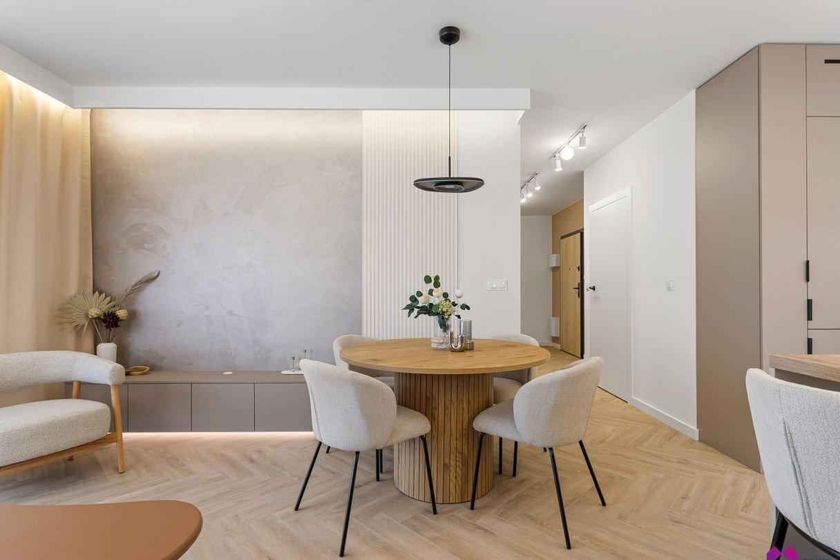 Mieszkanie wykończone pod klucz stylu nowoczesnym. Przestrzeń została zaaranżowana w lekkich, naturalnych barwach, przełamanych subtelnymi detalami. Eleganckie i przytulne dodatki podkreślają klimat wnętrza.
