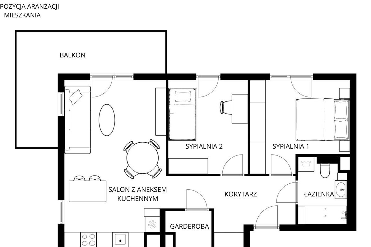 Salon z aneksem kuchennym został zaprojektowany z funkcjonalnym podziałem na strefy: wypoczynkową z wygodną kanapą oraz miejscem na telewizor, odpowiednio wydzieloną strefą jadalnianą oraz aneksu kuchennego. Z salonu można również wyjść na balkon, który latem stanie się naturalnym przedłużeniem salonu.