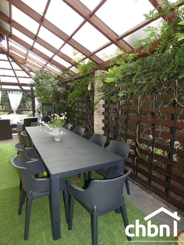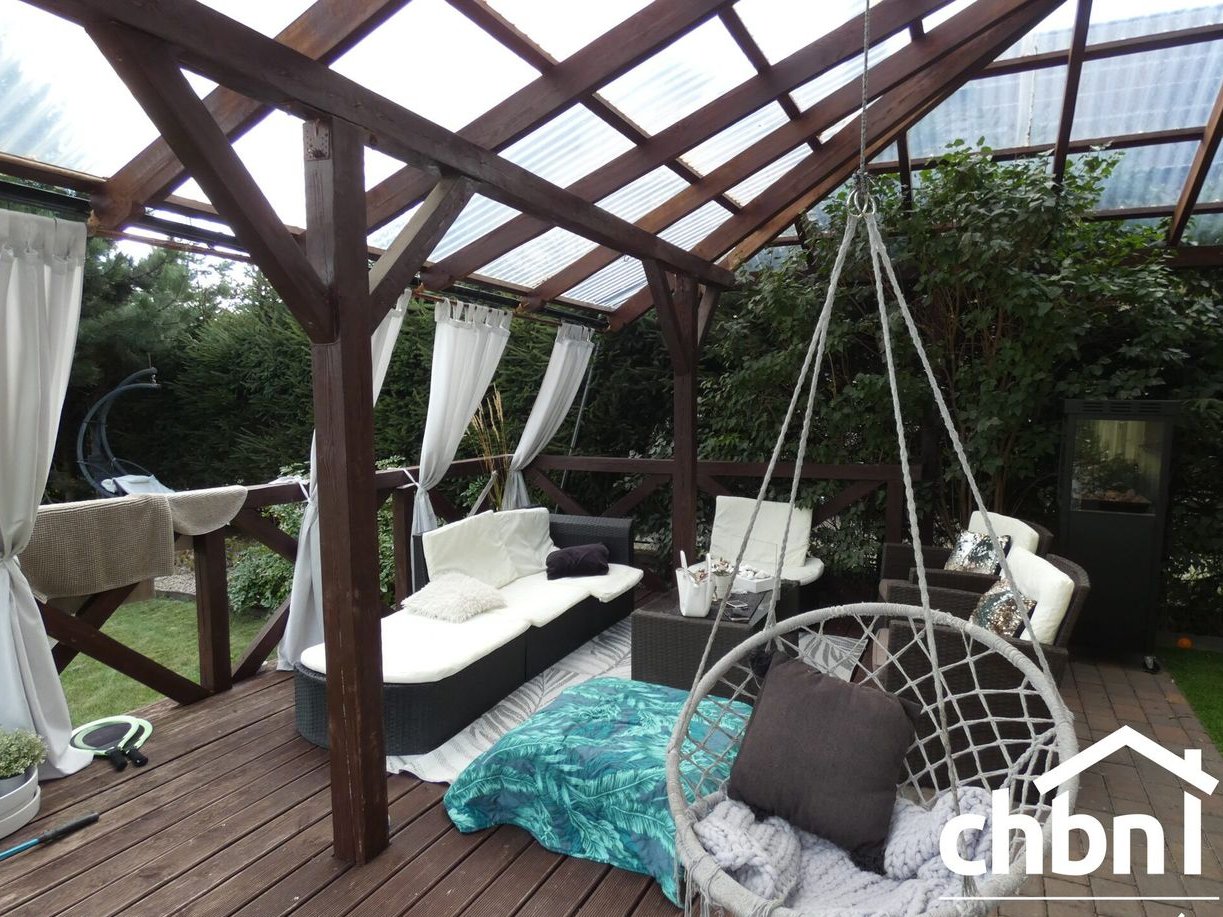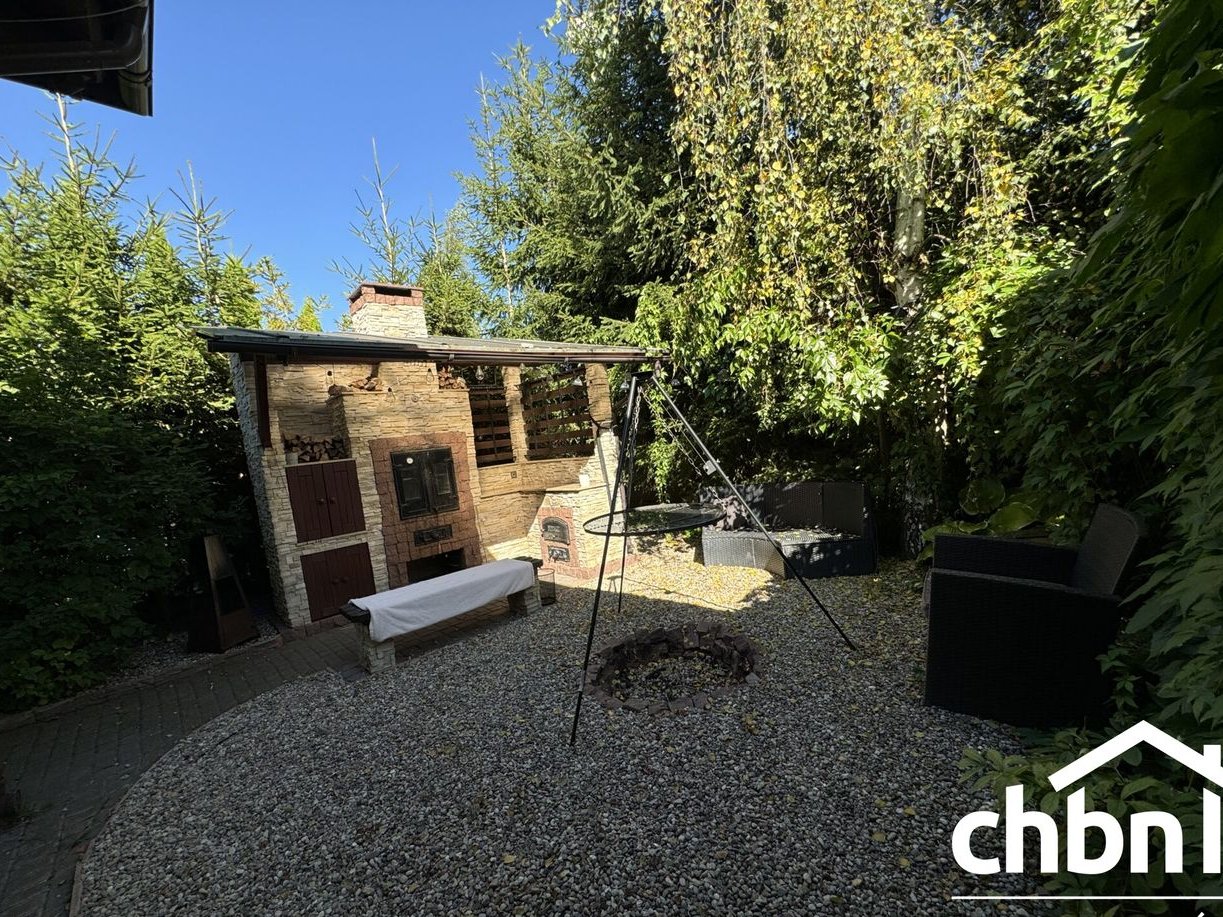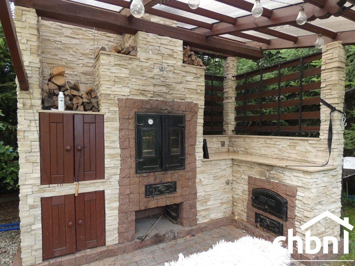 Ogród otaczający dom został starannie zaprojektowany. Znajduje się w nim duża wiata z przeznaczeniem na drewno i przedmioty gospodarcze oraz szopa drewniana z miejscem na składowanie opału. Dla koneserów grillowania- z tyłu domu oryginalnie zaprojektowana wędzarnia z grillem. Wykończona z niezwykłą starannością (dekoracja z piaskowca, zadaszenie z poliwęglanu). Atrakcyjności działki dodaje kompleksowe oświetlenie całego budynku oraz ścieżki. Na posesji znajdzie się również miejsce na wypoczynek i relaks po trudach dnia codziennego.