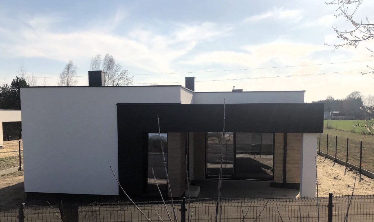 Elewacja: tynk mineralny w kolorze białym i grafitowym oraz z drewnopodobnymi elementami dekoracyjnymi.