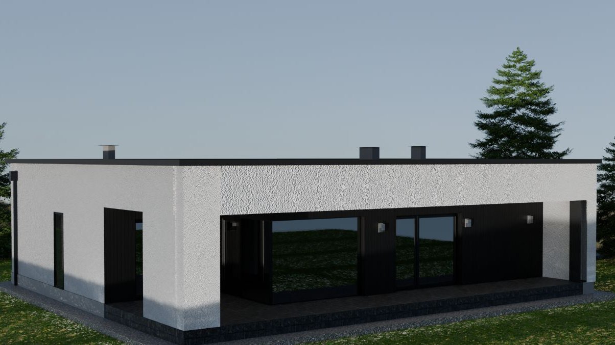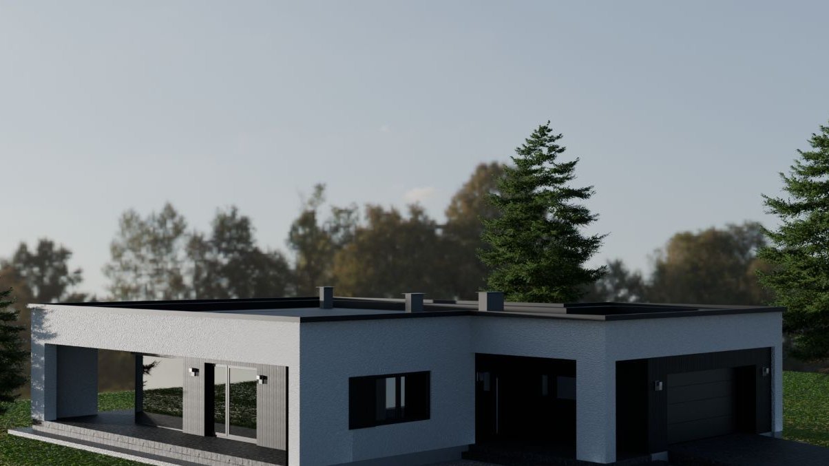 Budynek jest wolnostojącym parterowym domem jednorodzinnym z płaskim dachem. Dom charakteryzuje rozległa strefa dzienna. Wnętrze zostało zaprojektowane z myślą o maksymalnym komforcie mieszkańców, wyróżnia się czytelny podział na strefy użytkowania. Przestrzeń dzienna posiada płynne połączenie z narożnym tarasem, przesuwne przeszklenia zastosowano zarówno w salonie, jak i w jadalni. Wygodne przygotowywanie posiłków oraz przechowywanie zapewnia optymalnie zorganizowana kuchnia, w której przewidziano miejsce na obszerne blaty robocze, nowoczesną wyspę kuchenną oraz przyległą spiżarnię. W części prywatnej zaprojektowano trzy wygodne sypialnie, wśród nich znajduje się pokój rodziców z bezpośrednim wyjściem na taras. Wyjątkowy komfort oferuje domownikom łazienka w strefie prywatnej, wyposażona w wannę, prysznic, a także zestaw umywalek. Przewidziano także dodatkowo drugą łazienkę, kotłownię połączono z funkcją pralni, a przez wiatrołap umożliwiono szybkie przejście do dwustanowiskowego garażu !!!!!!!!!!!