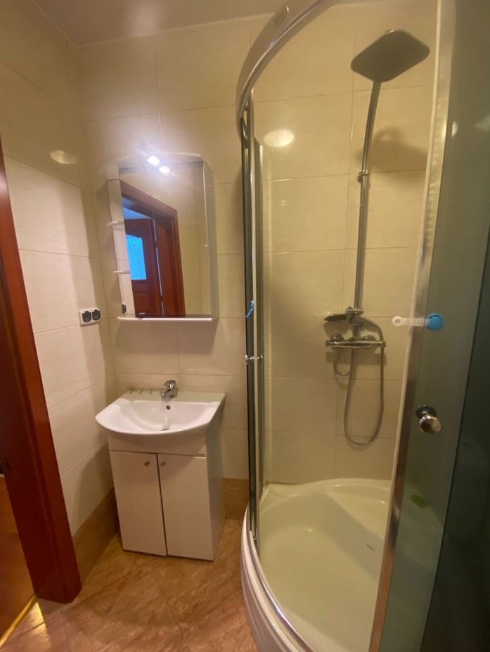 Lazienka - prysznic z wysokim brodzikiem, pralko-suszarka (kupiona w zeszlym roku - chyba nawet mam jeszcze dokumenty do gwarancji).