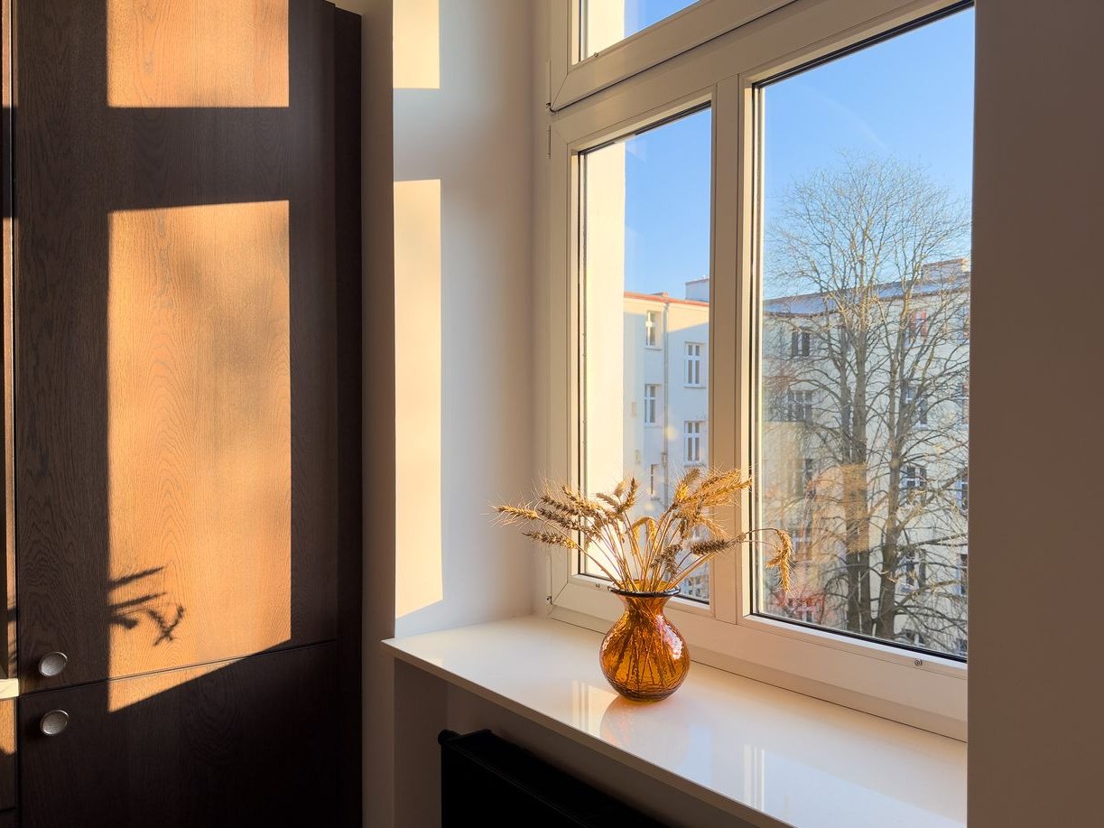 Wschodnia wystawa okien zapewnia dużo naturalnego światła do południa i chroni przed nagrzewaniem się mieszkania w lecie. W sezonie zazielenione drzewa na zewnątrz dodają więcej prywatności,
