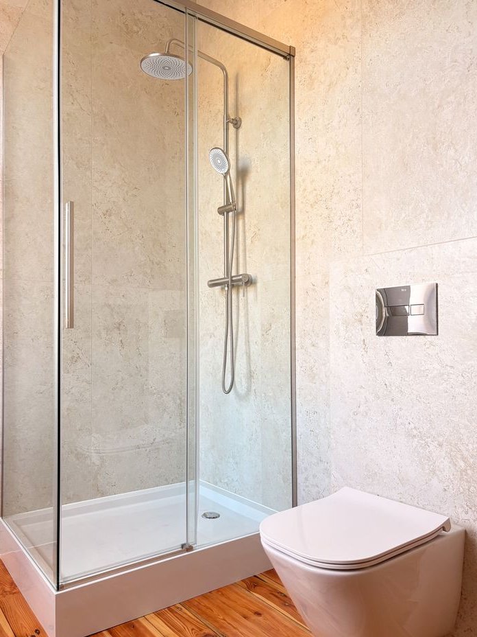 Łazienki (szafka podumywalkowa, umywalka, kabina prysznicowa, baterie szczotkowane, toaleta podwieszana).