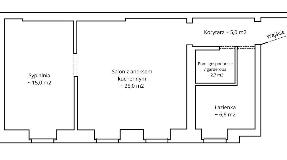 2 pokoje (salon z aneksem ~ 25,0 m2, sypialnia ~ 15,0 m2),
