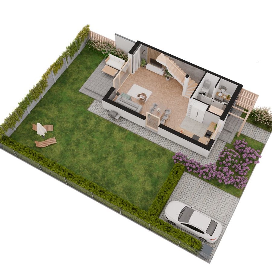 Dwa miejsca parkingowe z kostki brukowej dla każdego lokalu oraz taras i opaska wokół budynku.