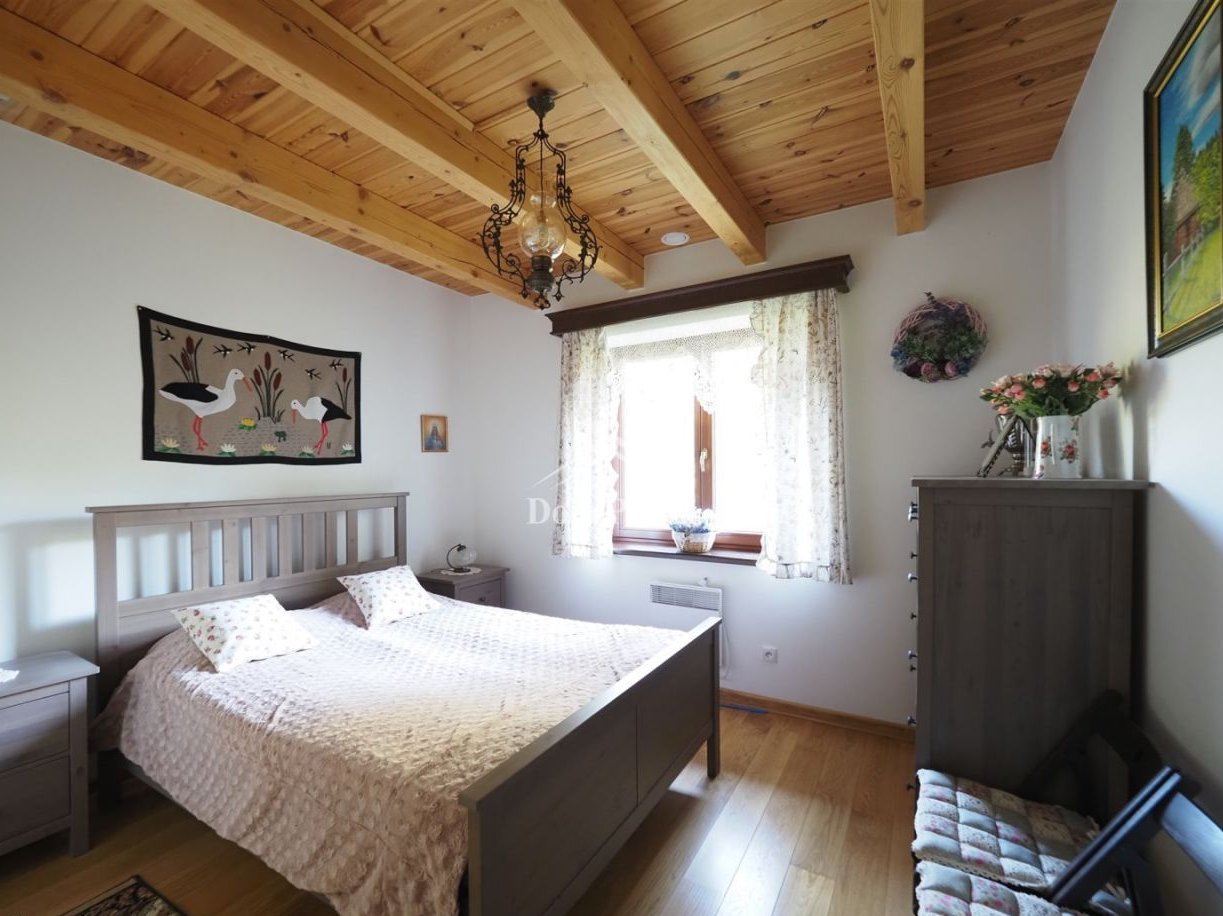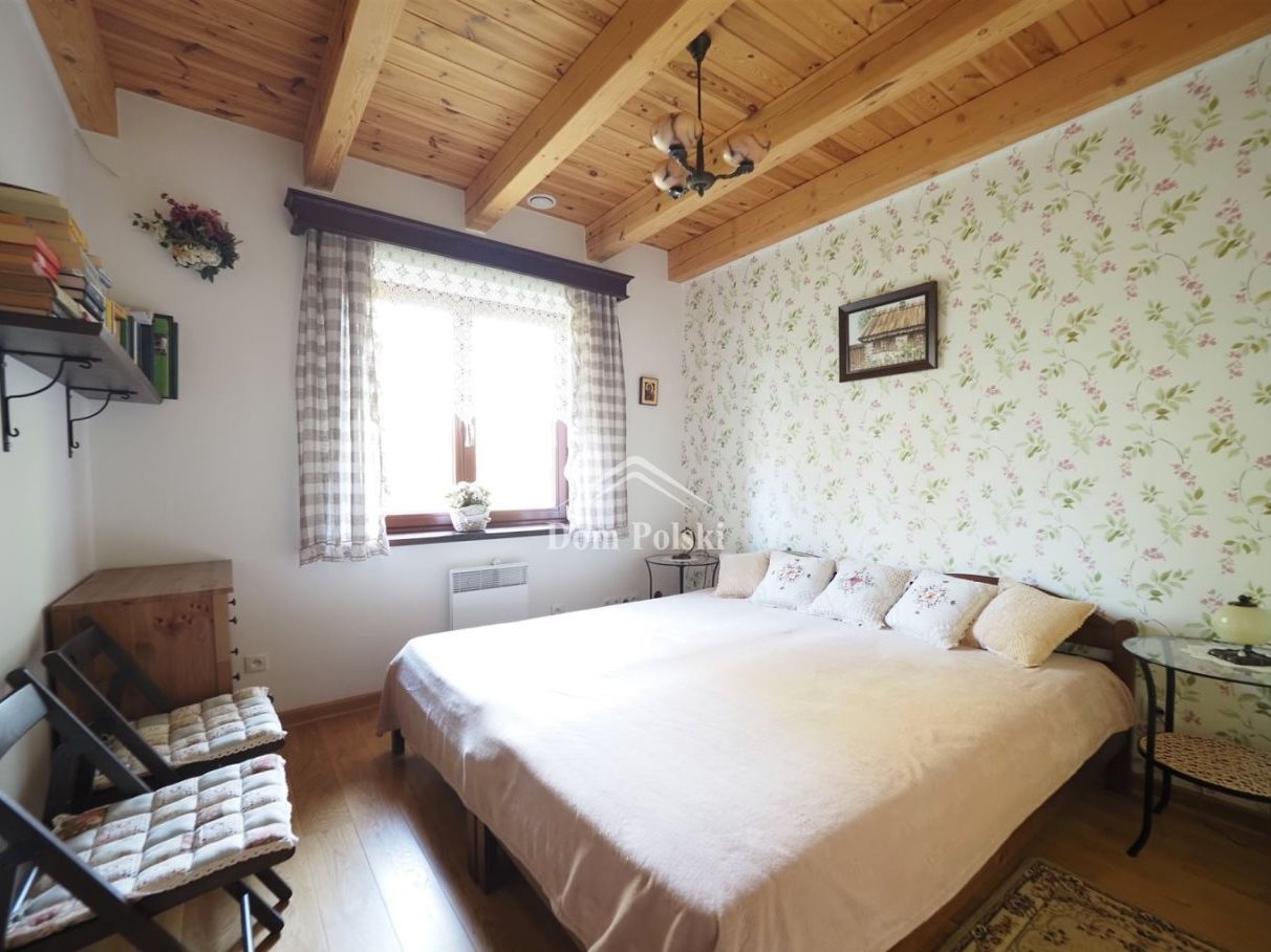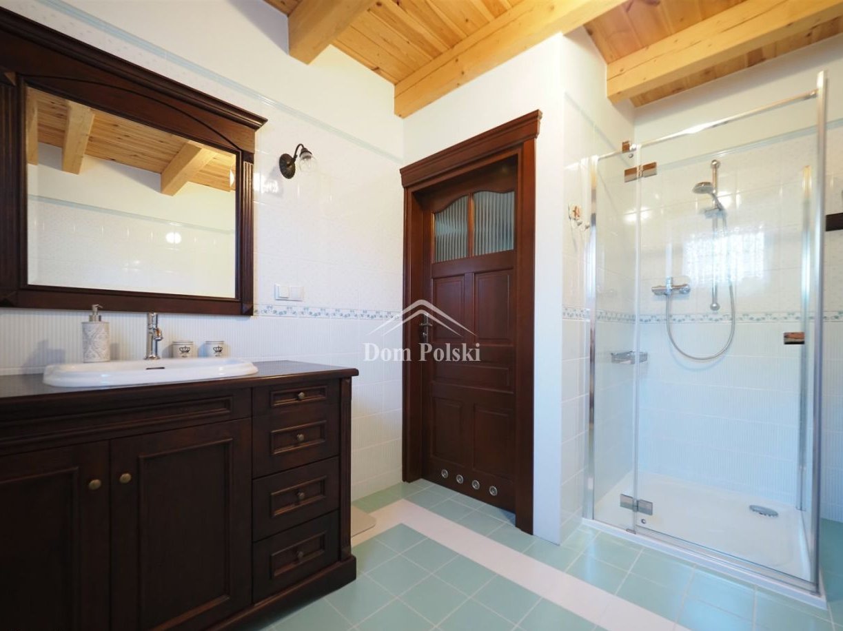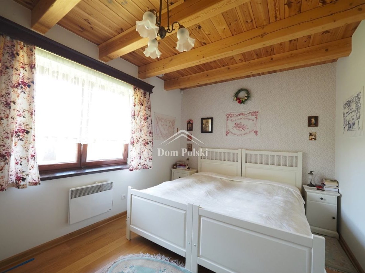 Dębowe schody prowadzą na poddasze o powierzchni użytkowej 66 m2, na którym wygospodarowano dwie sypialnie oraz garderobę. Ściany wykończone zostały boazerią a podłogi deską sosnową. Wszystkie sufity w budynku wyłożone zostały deską. Drzwi wejściowe antywłamaniowe.