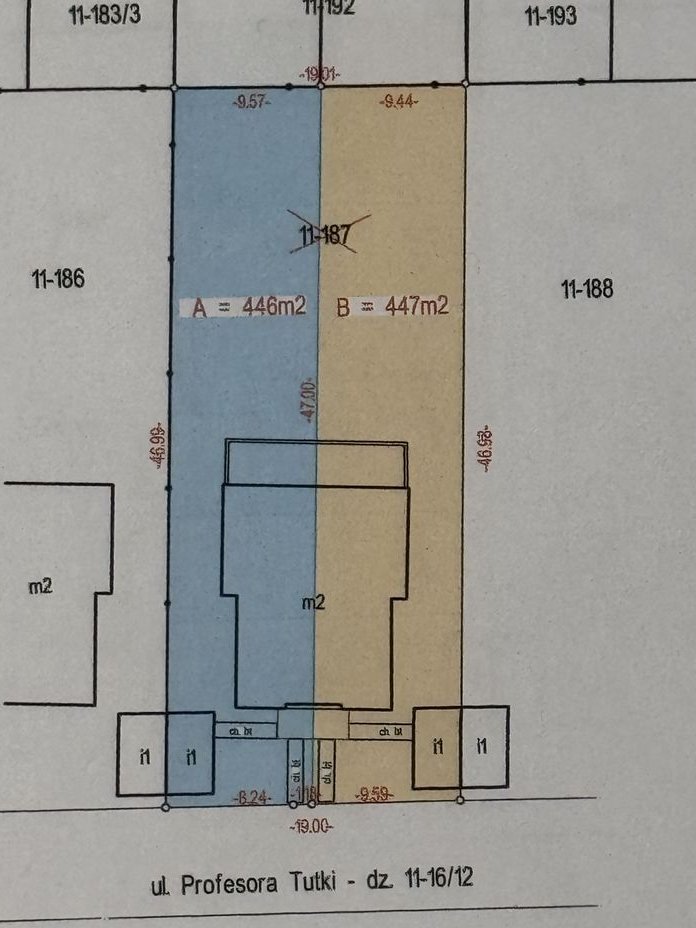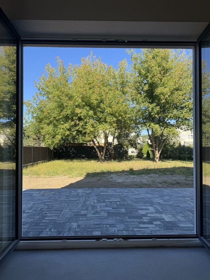 Wielkość działki na każdą połówkę bliźniaka to 450 m2 z pojedynczymi drzewami na każdej połówce.