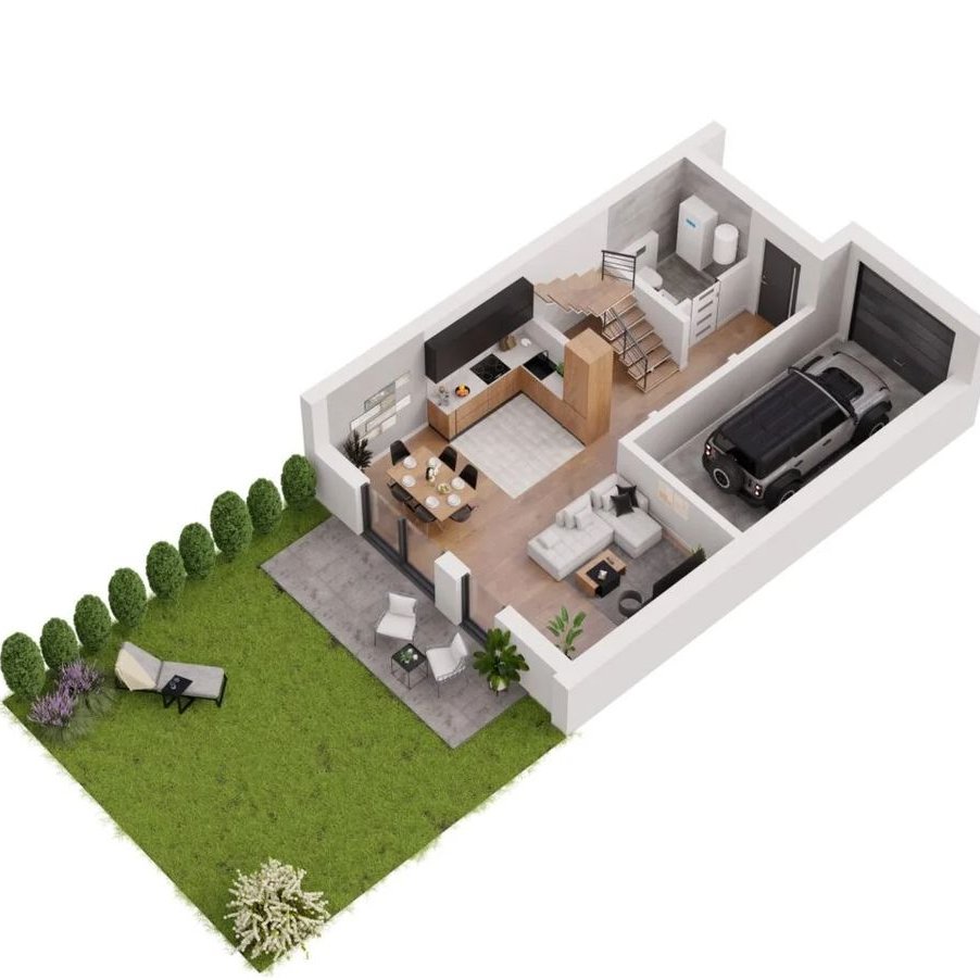 Twój prywatny ogród będzie stanowić idealne miejsce do wypoczynku i relaksu na świeżym powietrzu, oferując przestrzeń do zabaw dla dzieci, spotkań z rodziną czy uprawy roślin. Z kolei garaż w bryle budynku zwiększa bezpieczeństwo, zapewnia dodatkowe miejsce do przechowywania oraz ułatwia codzienne funkcjonowanie, dając bezpośredni dostęp do samochodu niezależnie od warunków pogodowych.