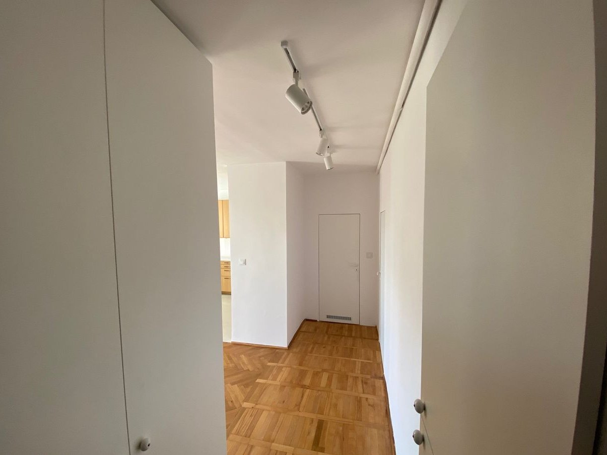 Korytarz: wejście do mieszkania od strony salonu, korytarz oddzielony ścianką oraz szafą