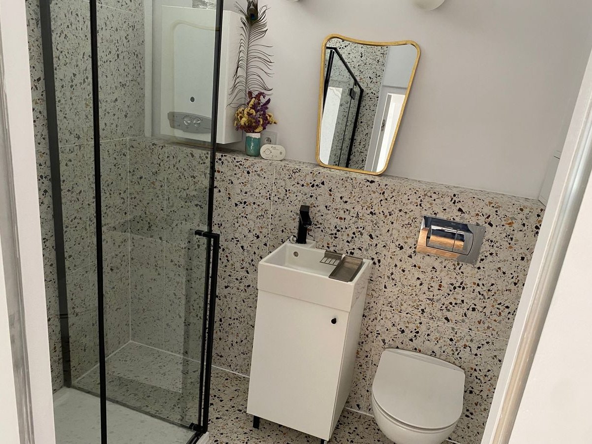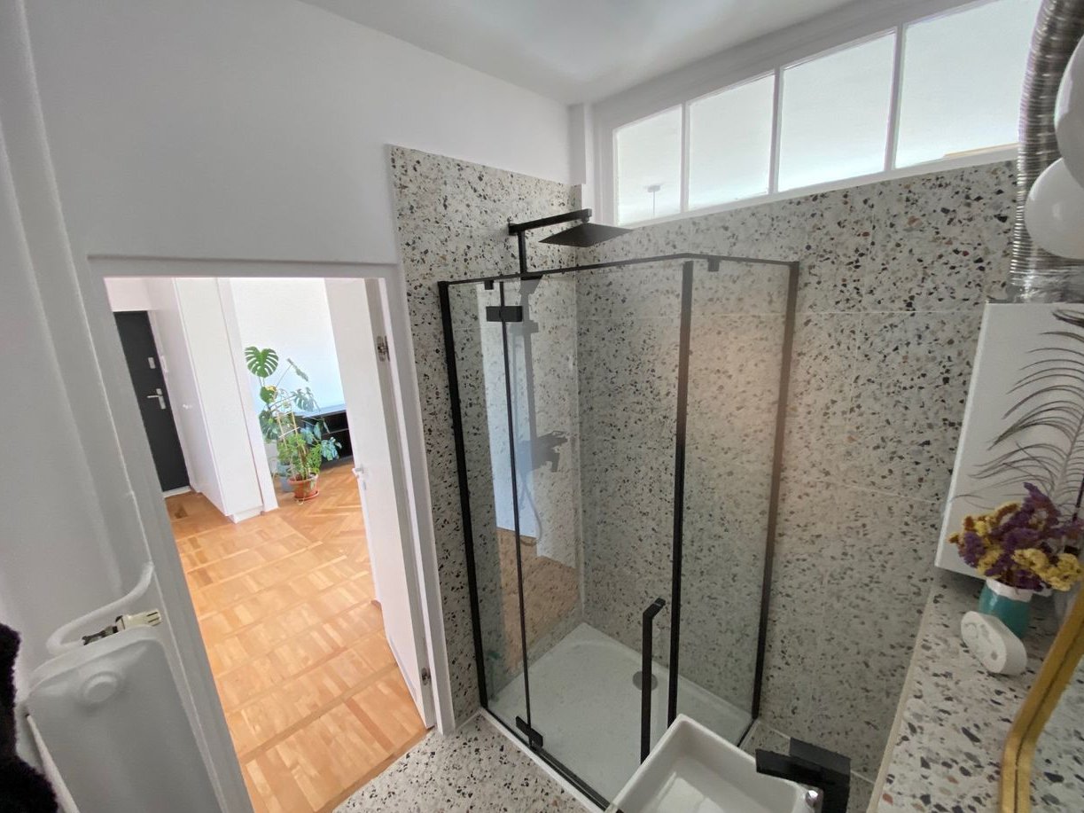 Łazienka: 3,5 m 2 , z nowoczesnym, niskim brodzikiem, wyłożona płytkami w stylu lastryko