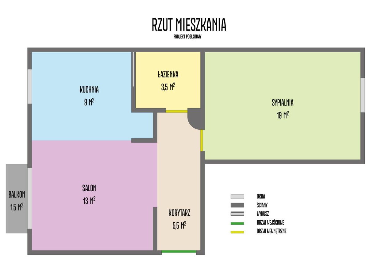 Układ: 2 przestronne pokoje, aneks kuchenny, łazienka oraz korytarz