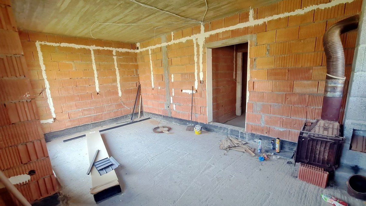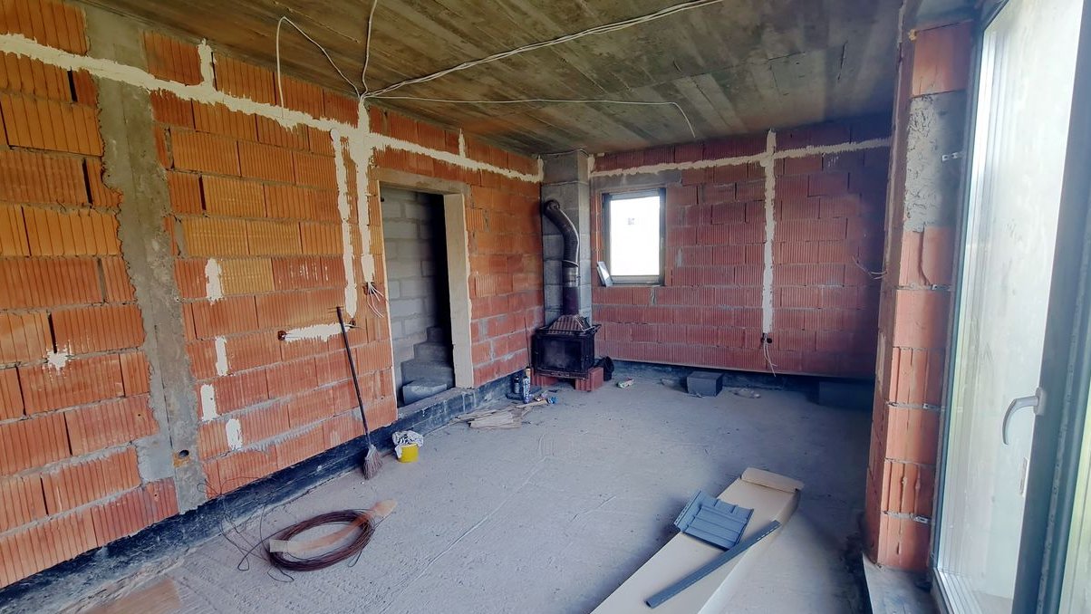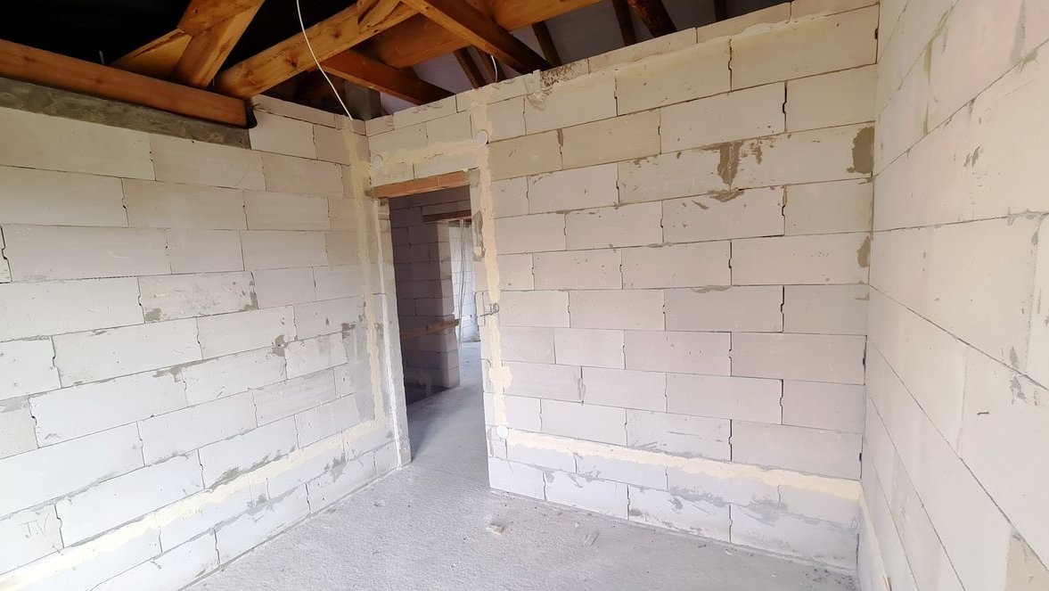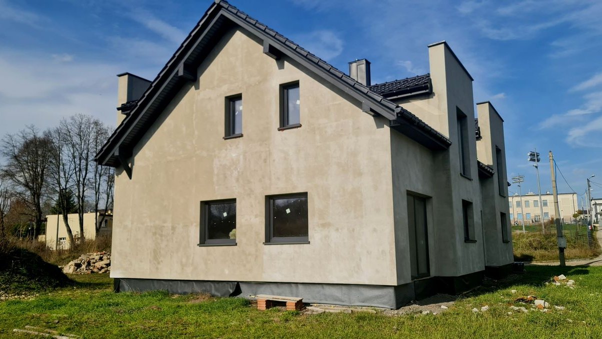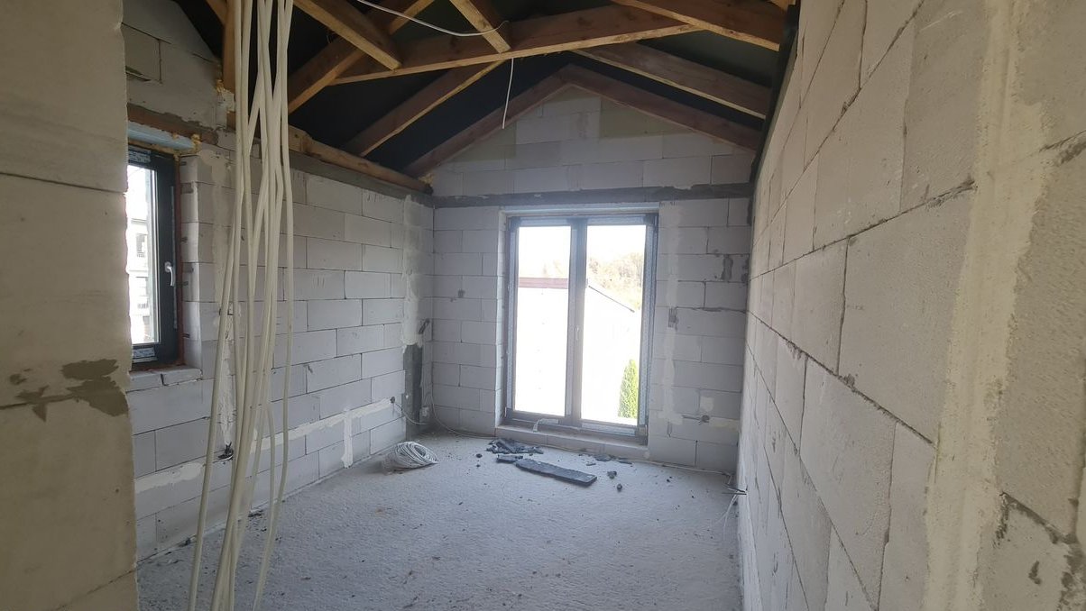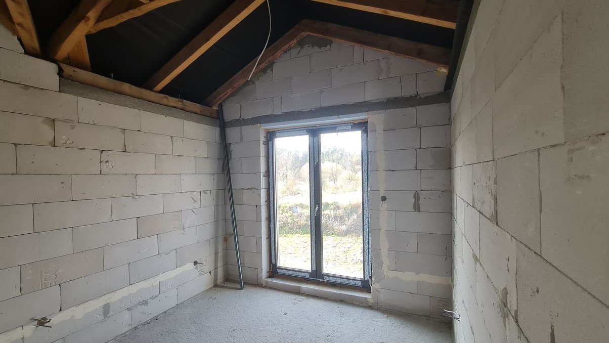 Budynek wzniesiony jest z pustaków, ocieplony styropianem grafitowym i przykryty dachówką ceramiczną KORAMIC. Okna Plastikowe, automatyczna brama garażowa, solidne drzwi wejściowe. Do budynku została doprowadzona woda i prąd. Do odbioru elewacja zostanie pokryta tynkiem akrylowym.