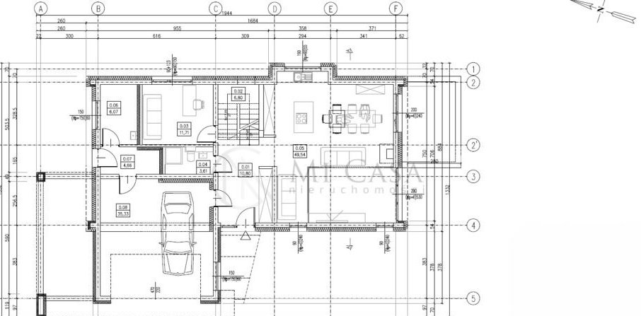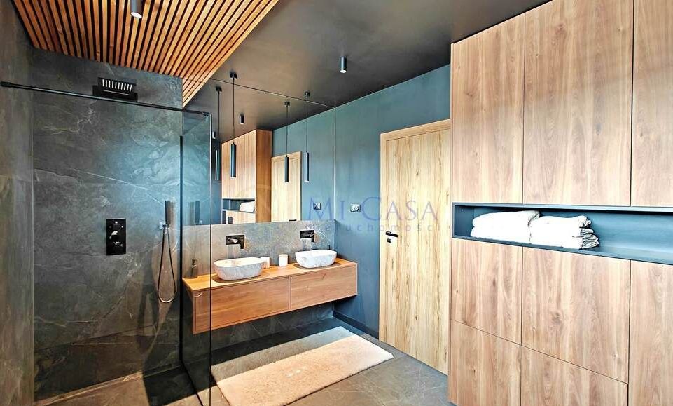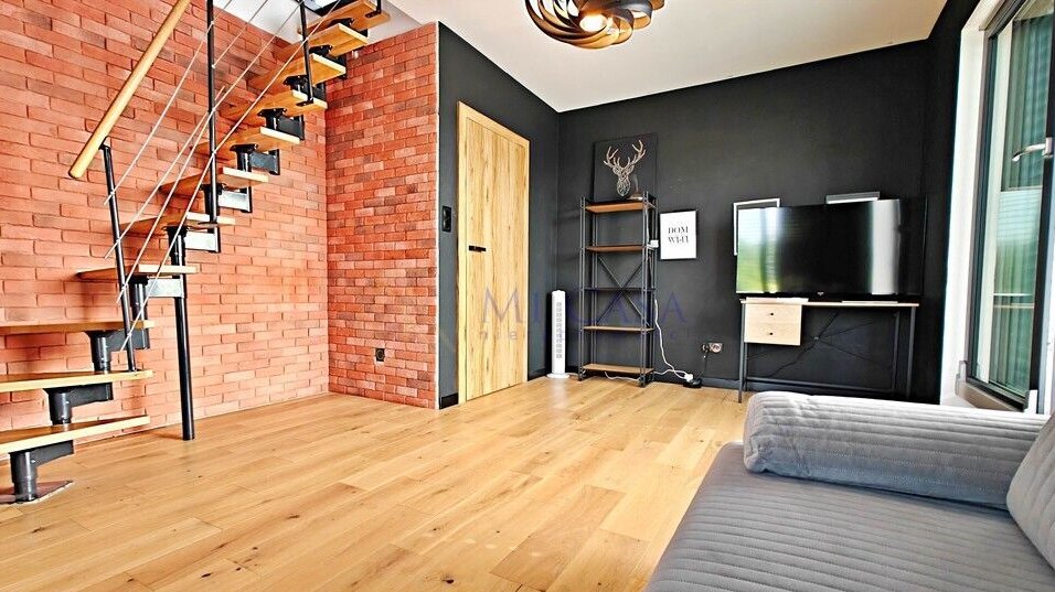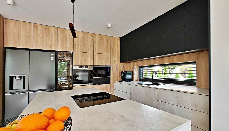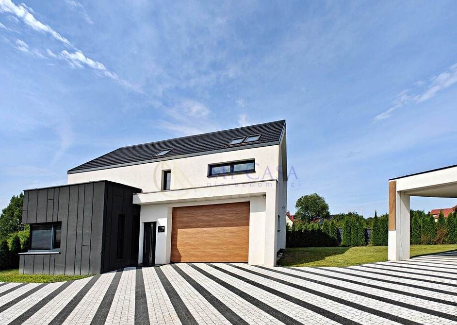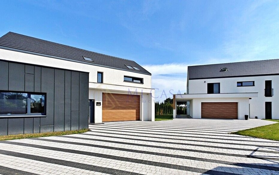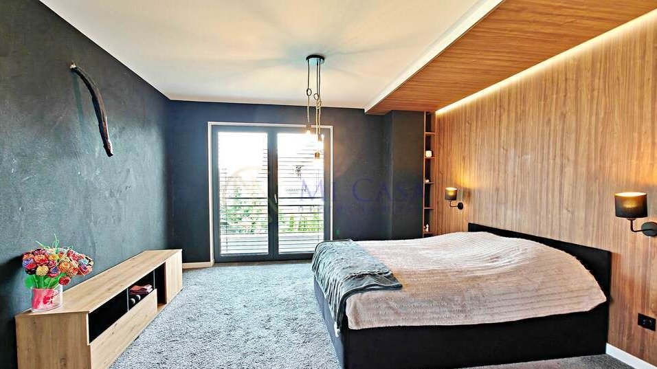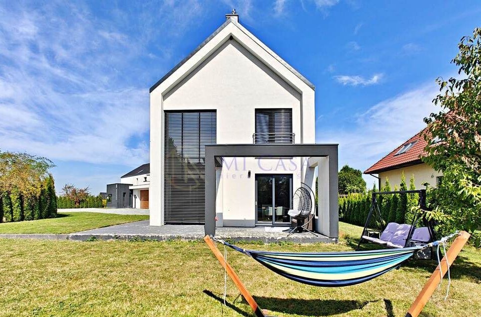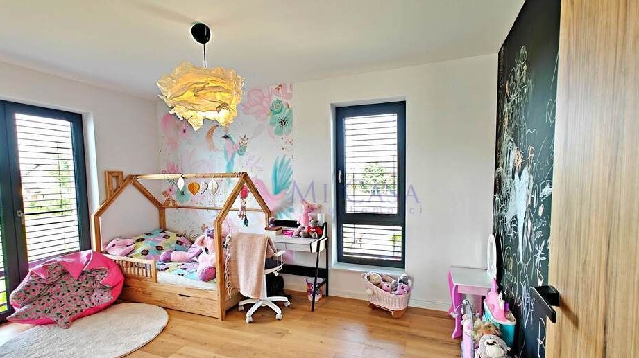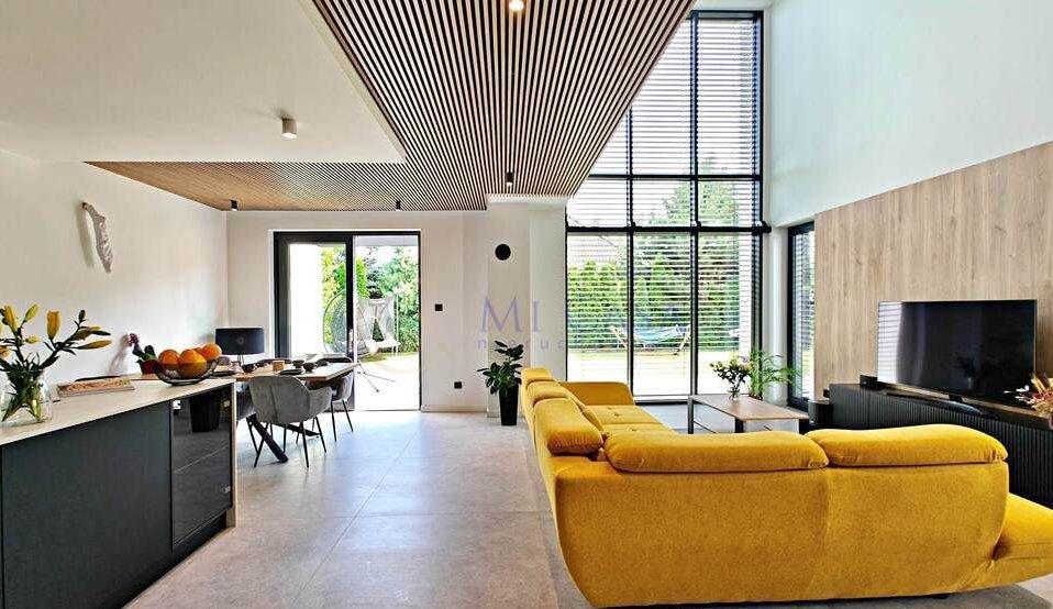 · Wykończenie domu: wnętrza wykończone zgodnie z projektem architekta, meble w zabudowie pod zamówienie, płytki wielkoformatowe, deska barlinecka, miękka wykładzina w sypialni głównej i na poddaszu. Łazienka na parterze z prysznicem. W łazience na piętrze poza prysznicem jest miejsce na np. wolnostojącą wannę. Nad salonem jest wspaniała otwarta przestrzeń (około 6 m wysokości)