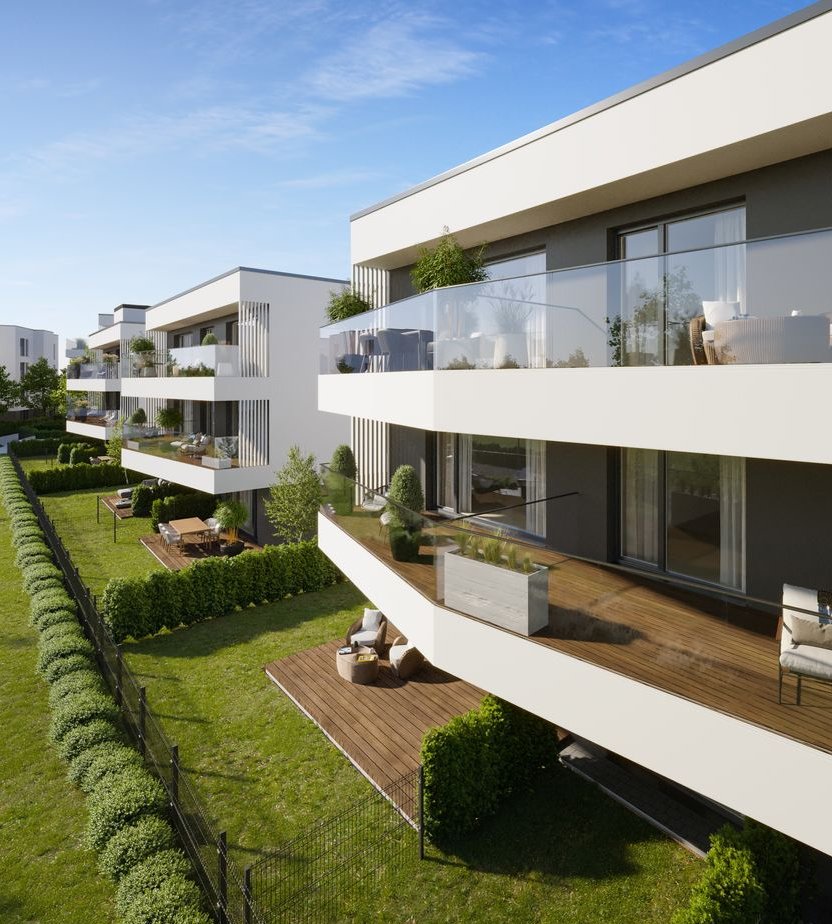 Prado jest wpisane w zieleń już istniejącą w otoczeniu inwestycji, ale także przestrzenie wspólne zostały w taki sposób zaprojektowane, aby mieszkańcy mogli cieszyć się swoim prywatnym kawałkiem przyrody. Każdy apartament posiada ogród lub przestronny, stylowy taras z przeszklonymi balustradami.