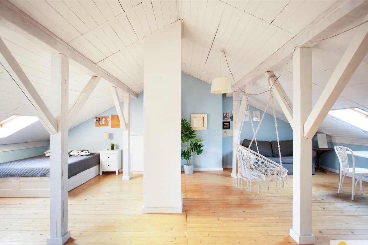 Ostatnią kondygnację budynku stanowi poddasze, gdzie obecnie znajduje się open space oraz garderoba. Można tu zaaranżować pracownię, strefę zabaw dla dzieci lub wydzielić pokoje.